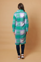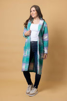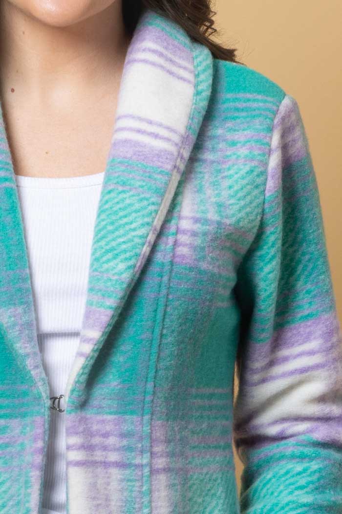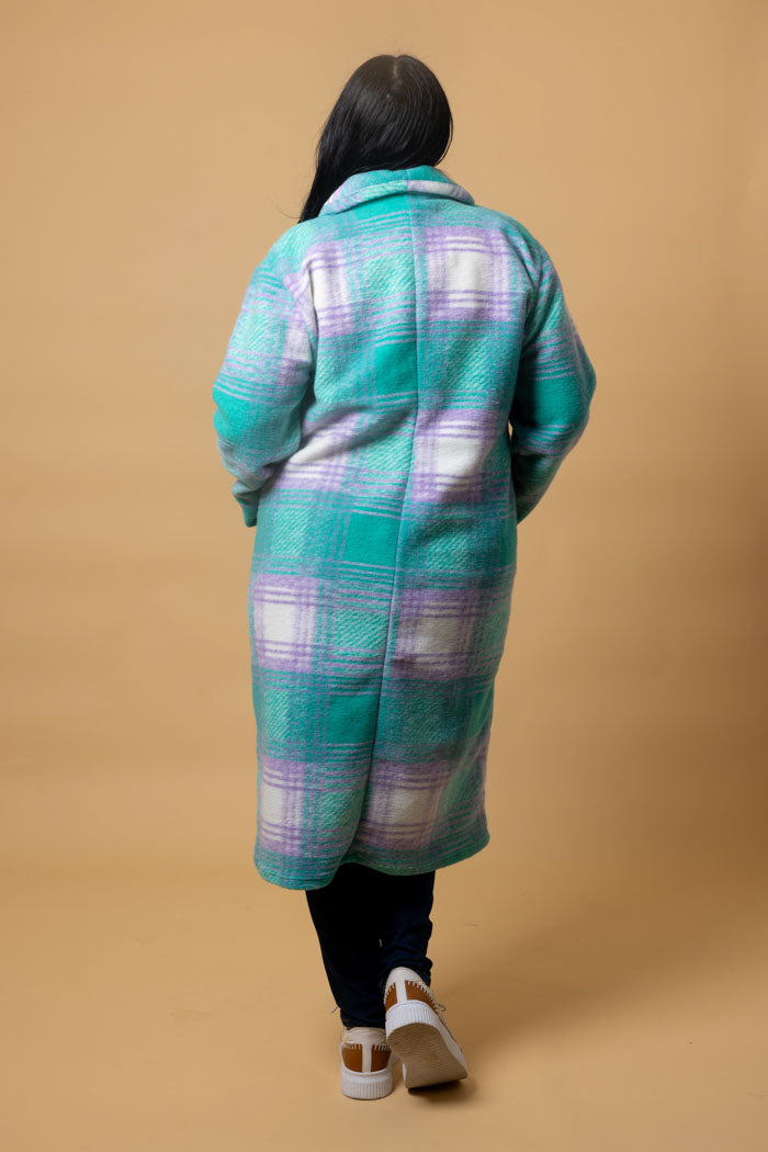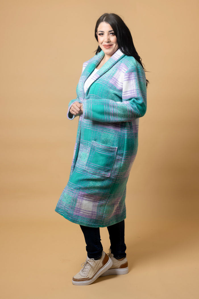 A long teal & lilac tartan cardigan coat.