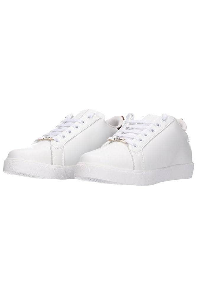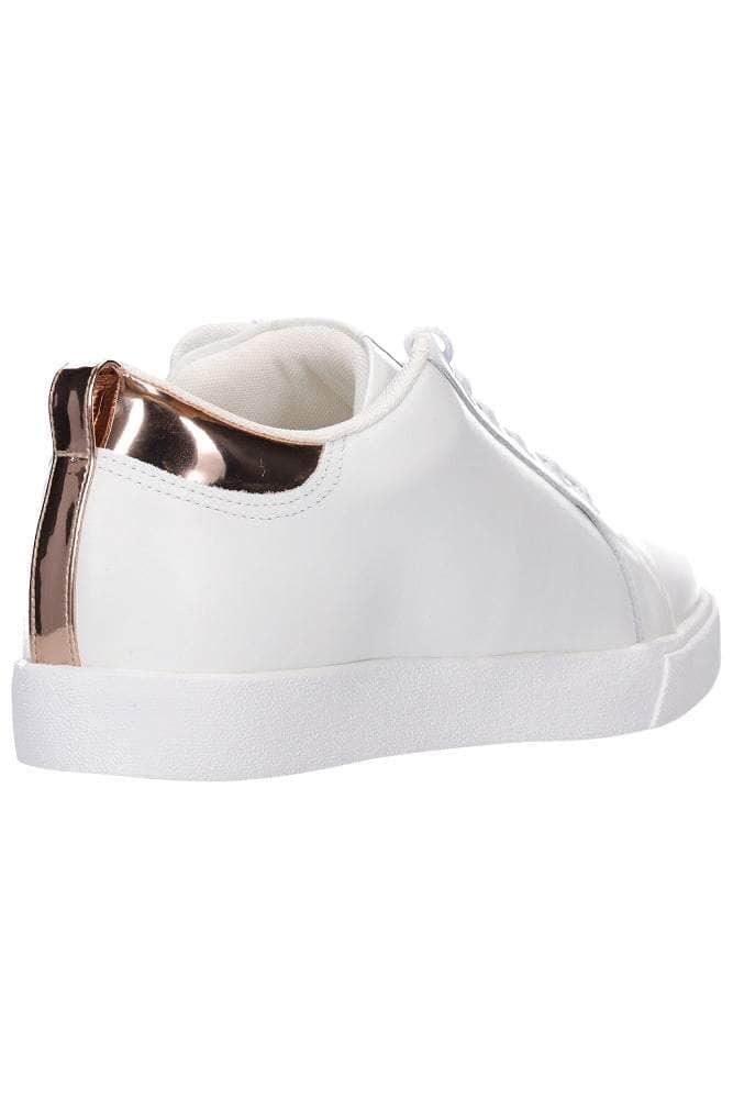 A classic white leather sneaker with a metallic rose gold heel panel