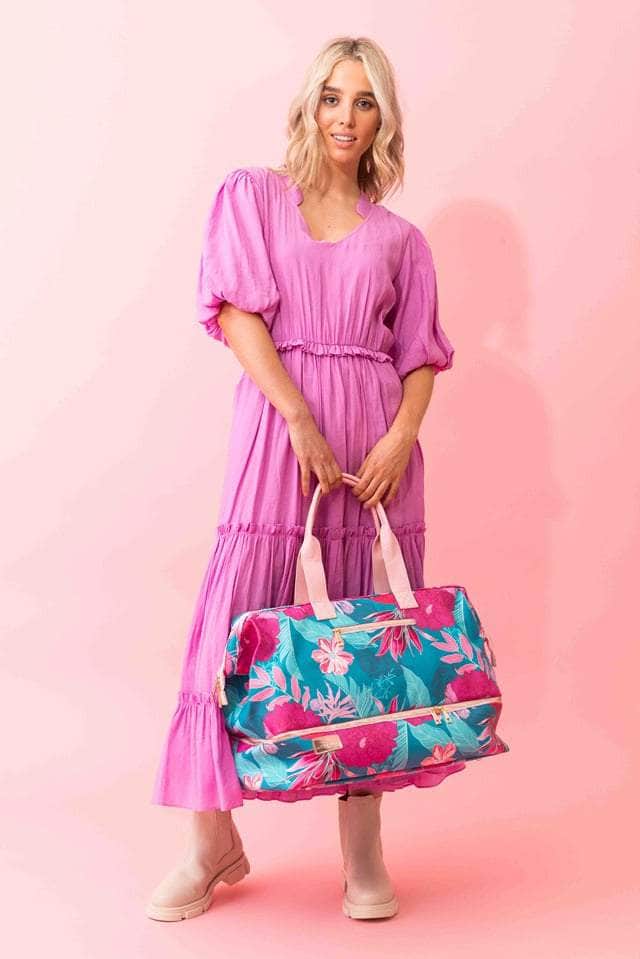 A blue teal & pink floral print overnight bag with zip up shoe compartment at the base. The interior has a padded sleeve for tablets or laptops, and small pockets for your valuables.