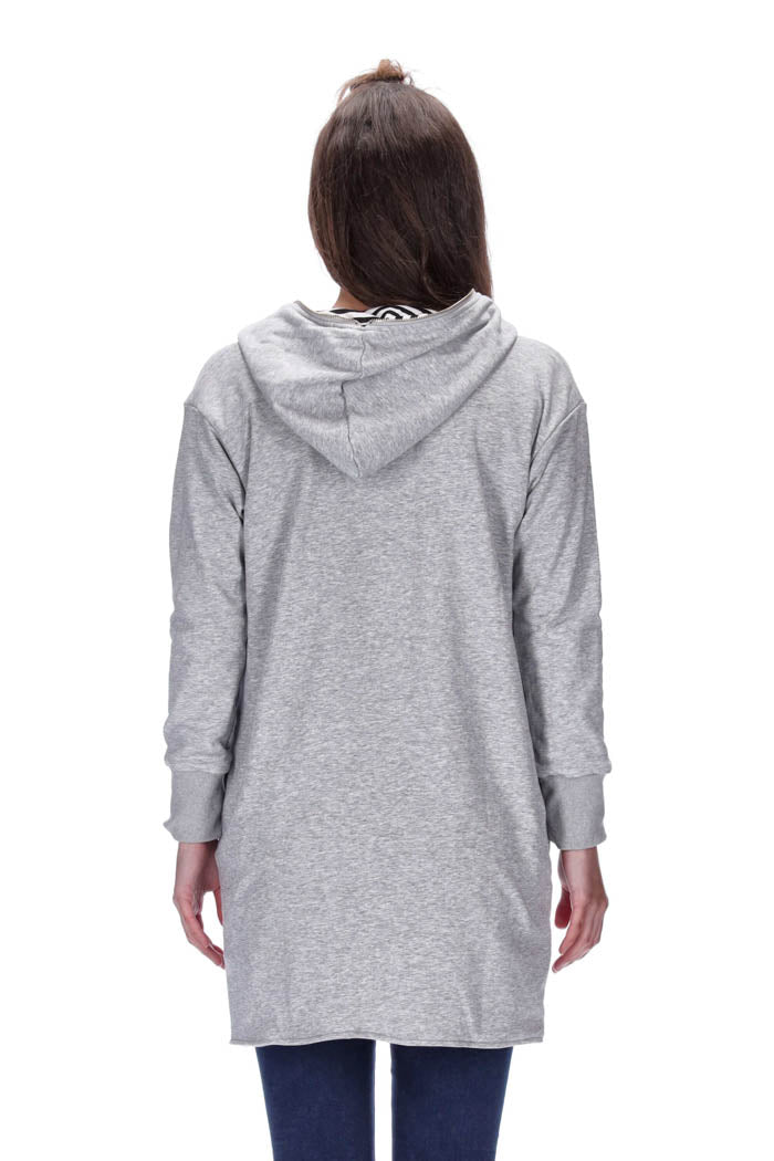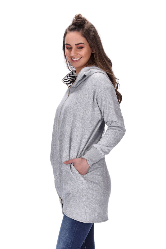 Features: REVERSIBLE Hooded Jacket with grey marle on one side or black stripe on the other, comes with pockets and a reversible metal front zipper