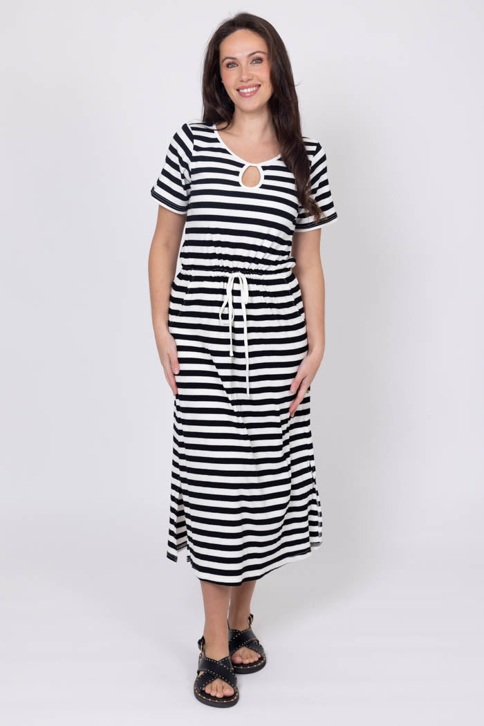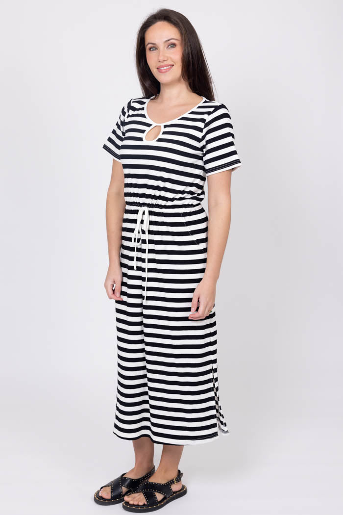 A solid black and white striped maxi dress with waist tie and front keyhole detail.