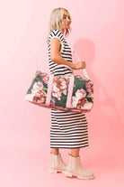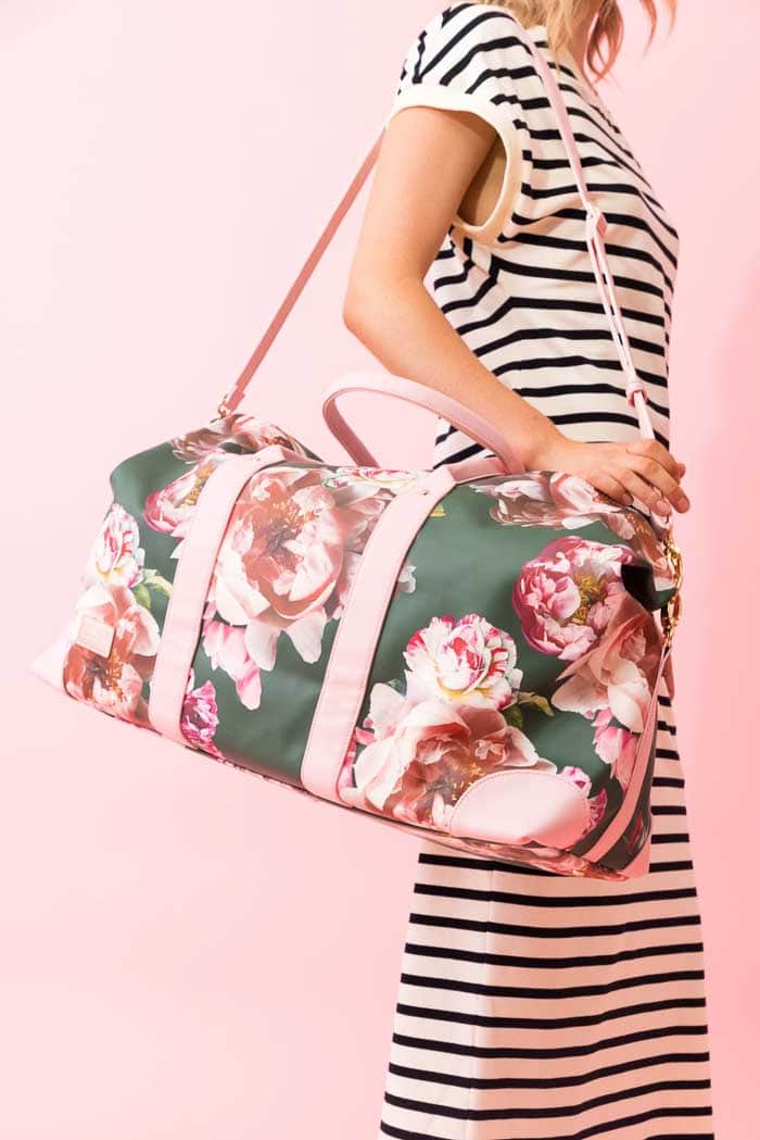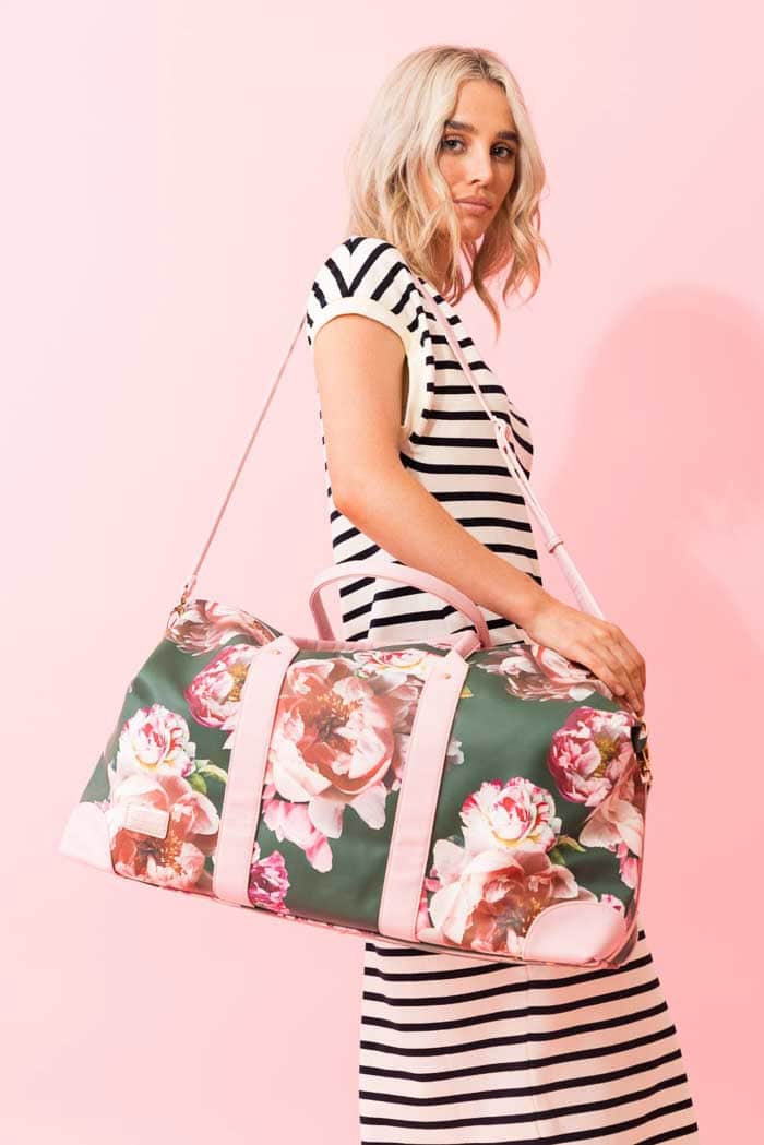 The perfect overnight bag! A dark green based pink floral print duffle bag, with light pink handles and shoulder strap.
