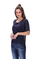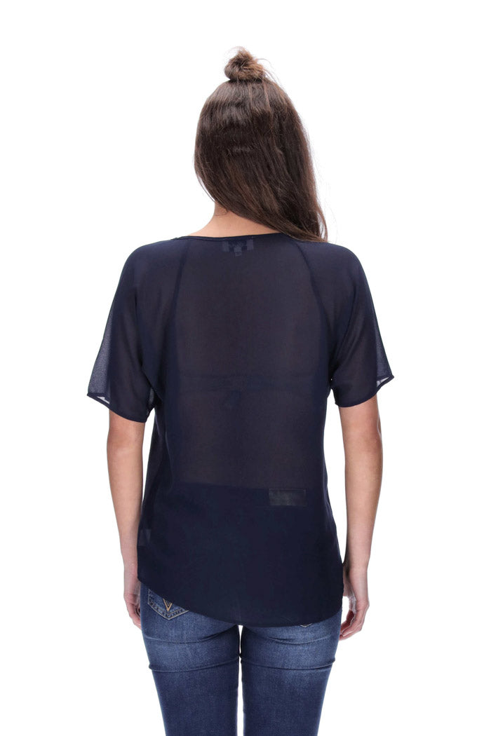 Features: Raglan Seam, contrast chiffon back and sleeves, curved hem, dipped back