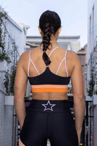 A black lower cut bra with removable padded cups, lilac double straps, and a two-toned elasticated band under the bust.