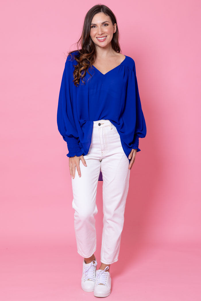 - Long sleeves with shirred cuffs