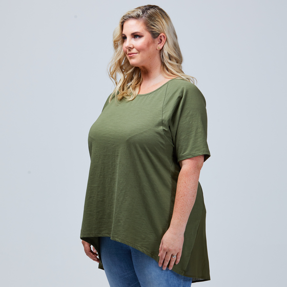 Features: Raglan seam, Textured Fabric, Chiffon Back and Scoop Hem.