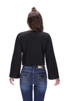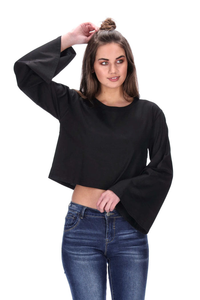 Features: Cropped length with flare long sleeves, self fabric binding and double needle hems