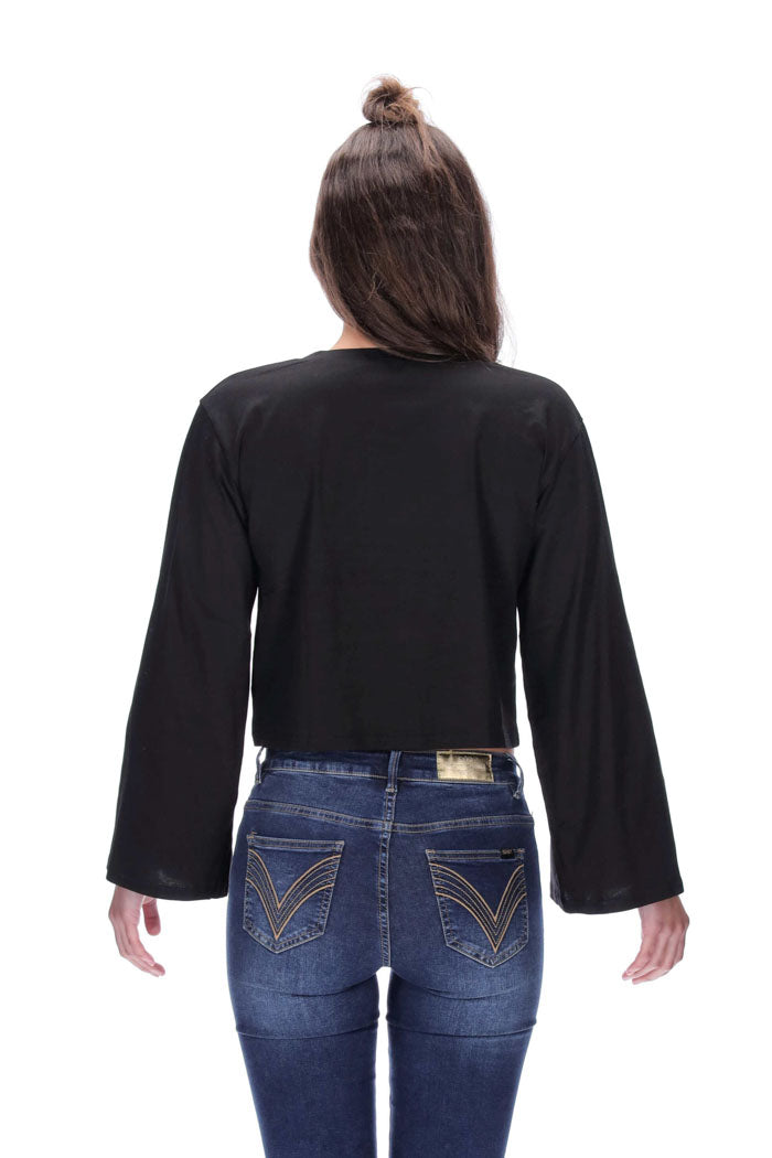 Features: Cropped length with flare long sleeves, self fabric binding and double needle hems