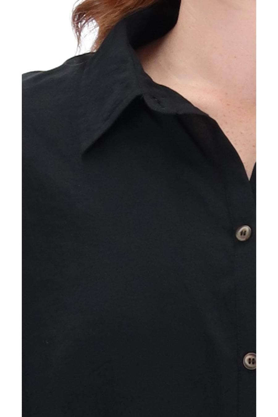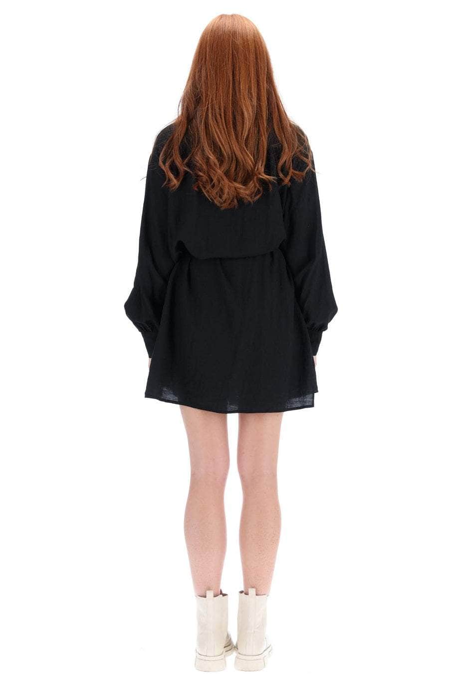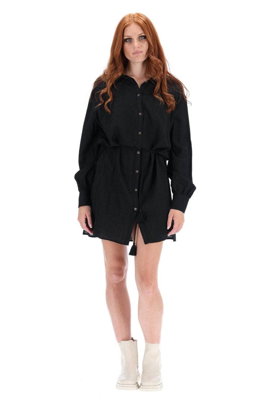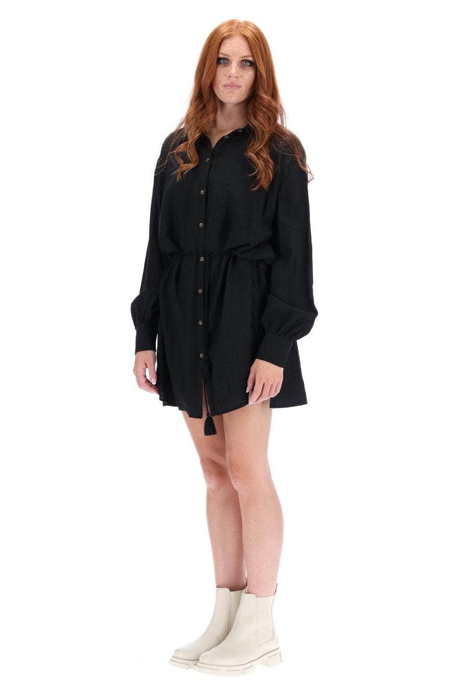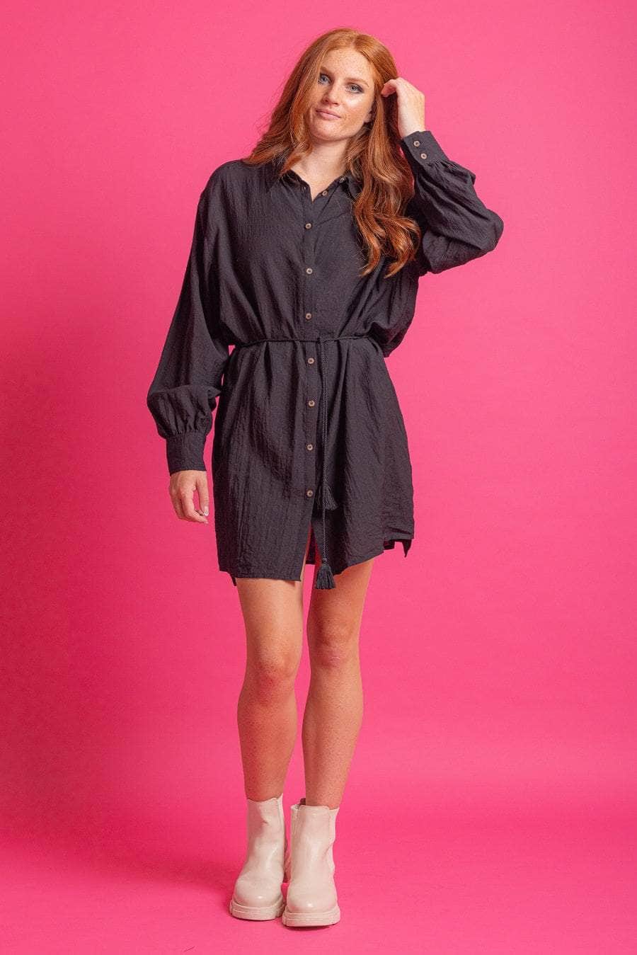 A black cotton-blend mini shirt dress with a tassel waist tie.