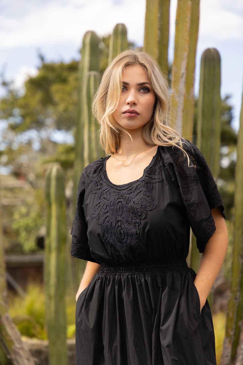 - Short raglan sleeves with embroidered eyelet lace flowers