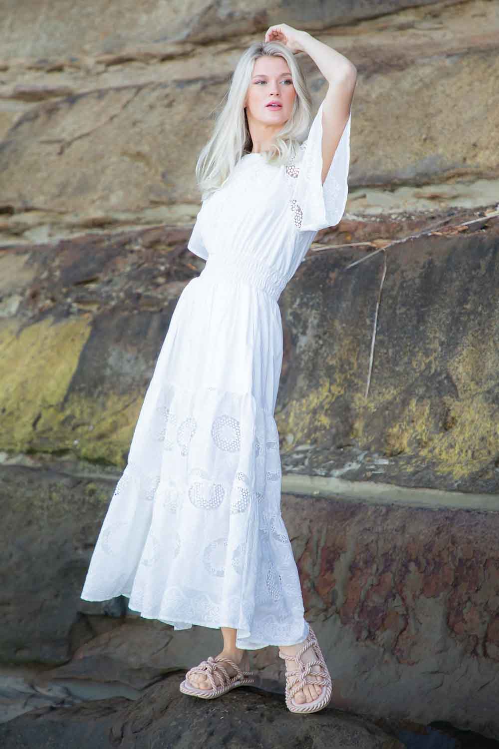 - Short raglan sleeves with embroidered eyelet lace flowers