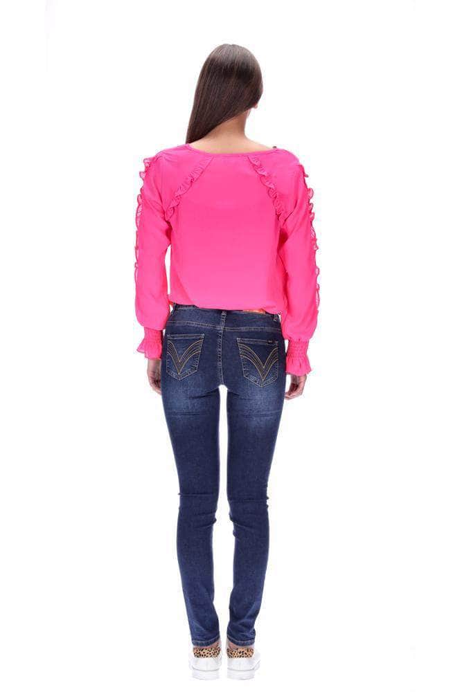 This is a dark stretch mid-rise jean with no rips and a light stonewash across the front and back.