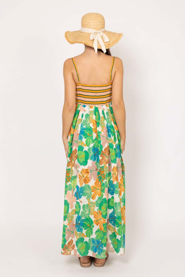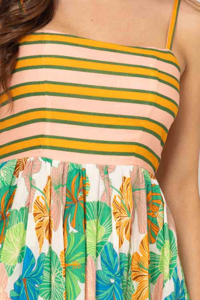 A mustard and peached striped bodice with floaty green floral lower skirt of the dress.