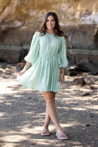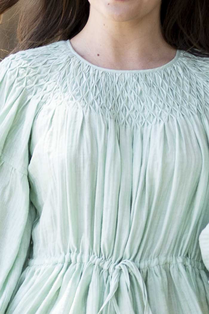 A flowy mint green dress with a waist tie to synch in at the waist.