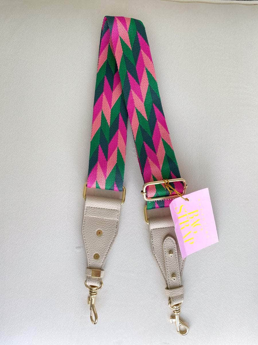 A pink and green adjustable woven bag strap with faux leather, and gold hardware clasps