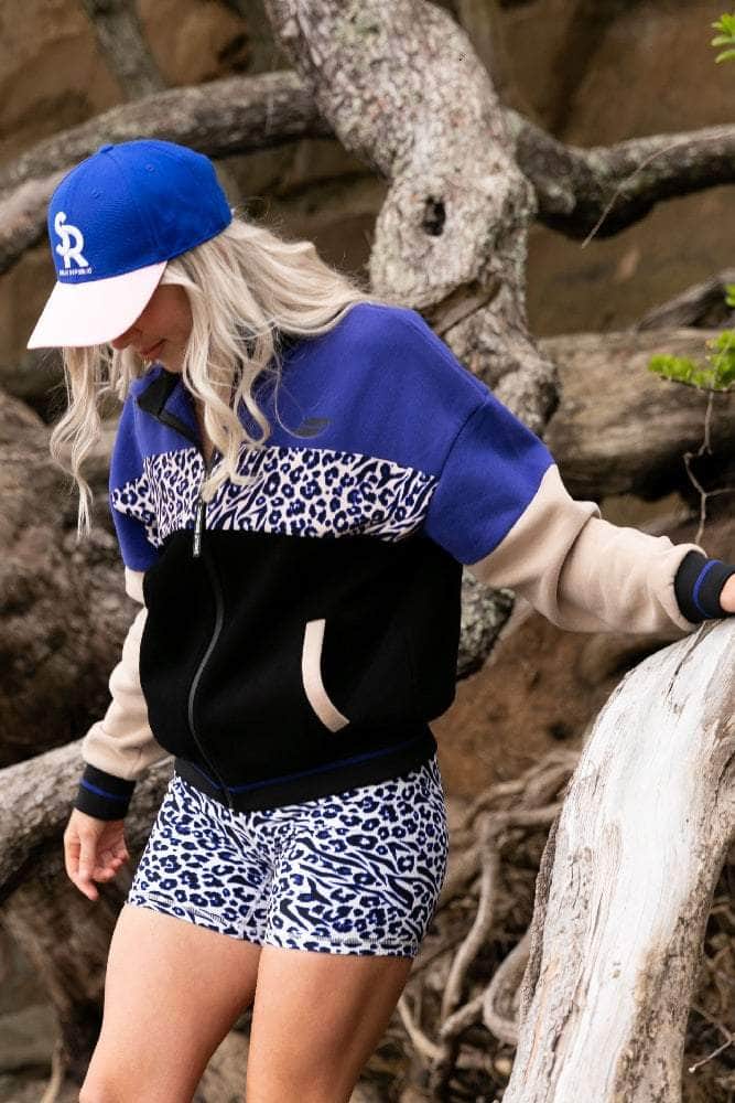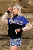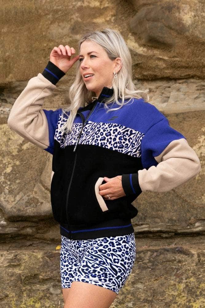 A gorgeous blue, black and beige crop jacket with a zip-down front, beige front pockets and a leopard print panel across the front & back. Neckline, cuffs and hem have wide striped black ribbing.