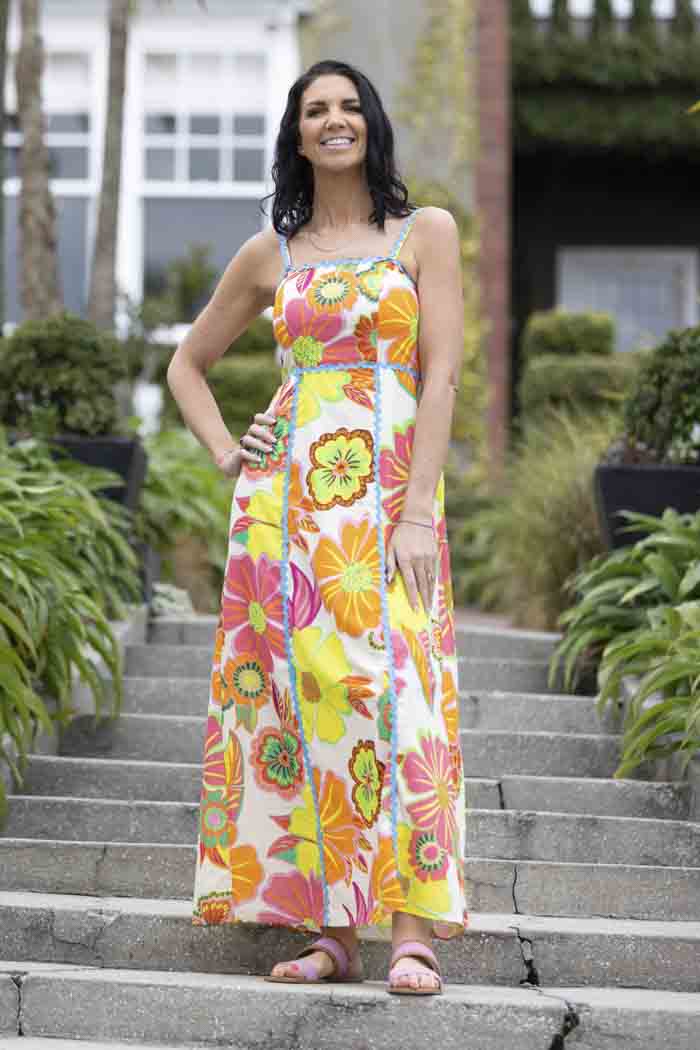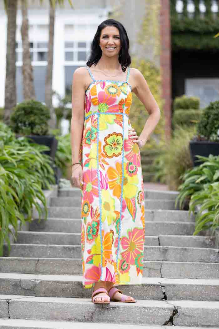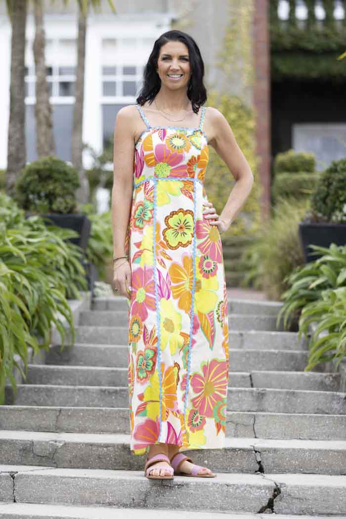 A bright floral maxi dress with blue piping.
