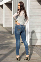 Mid-rise dark blue stretch denim with rips and a light stonewash
