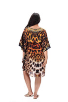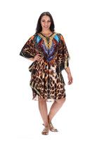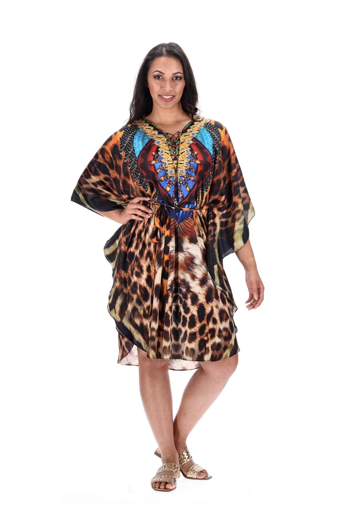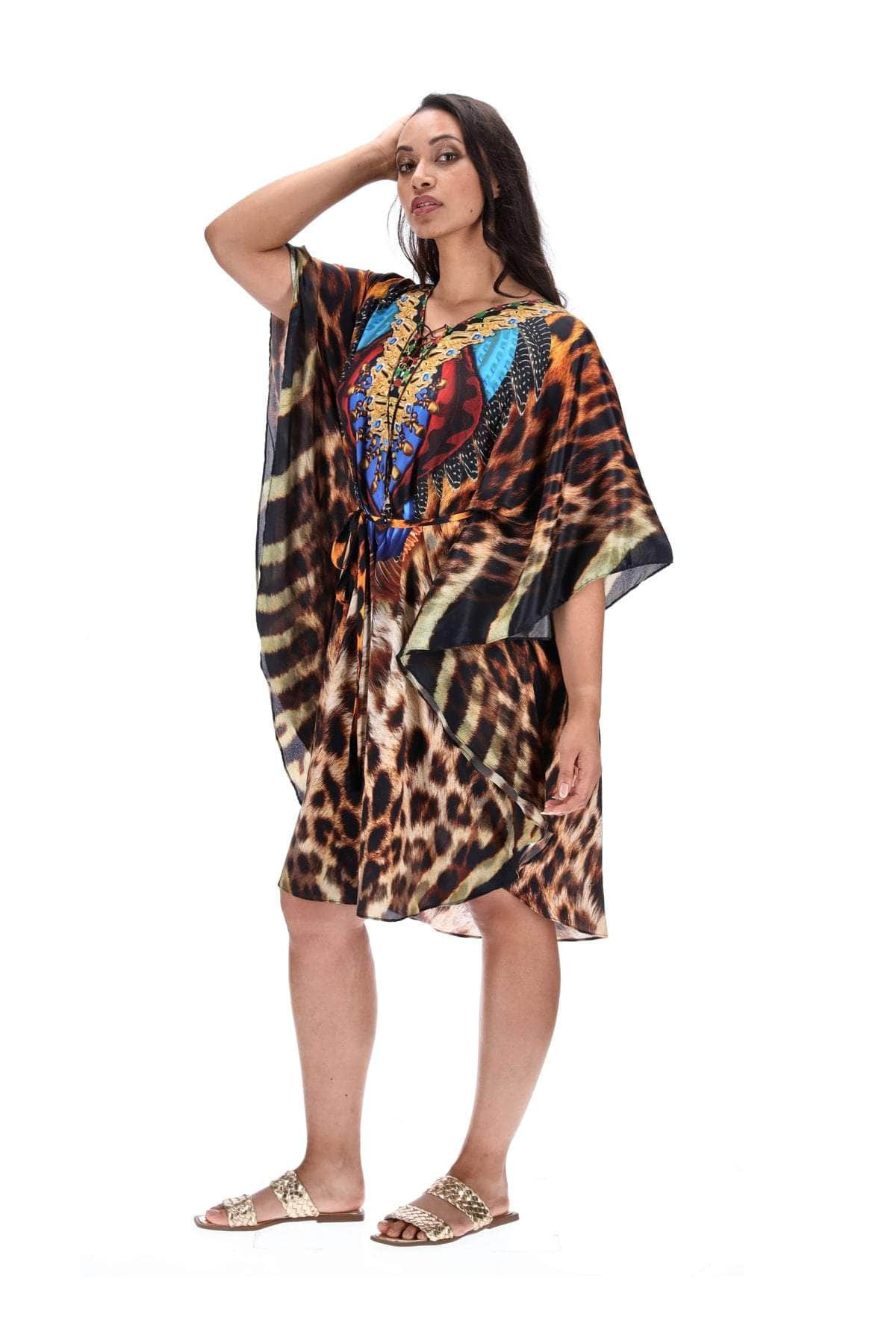 A jewel & abstract animal print kaftan dress with a tied V neck, short sleeves and a tied waist.