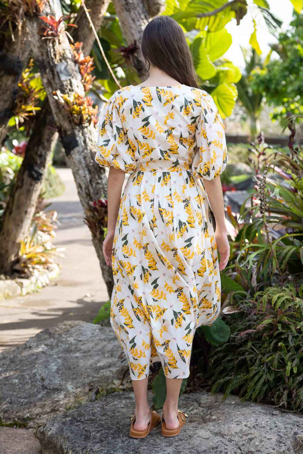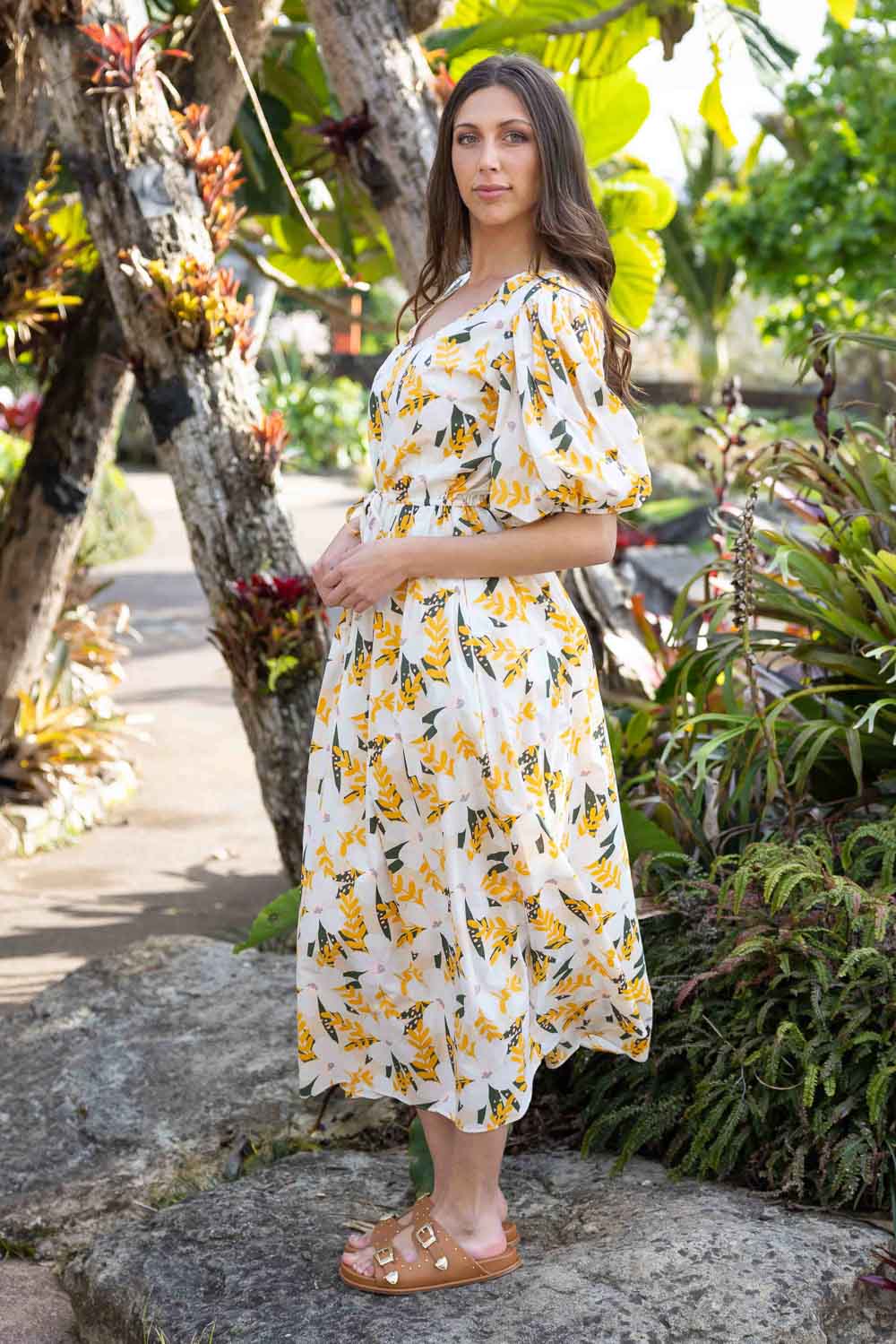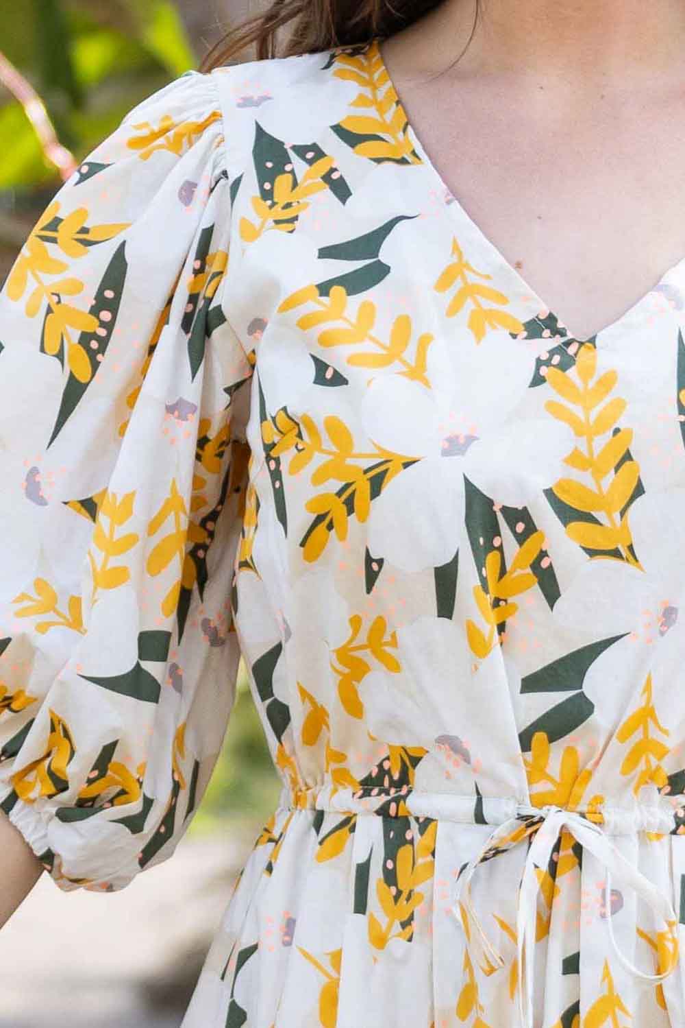 A yellow & white floral print V neck maxi dress.