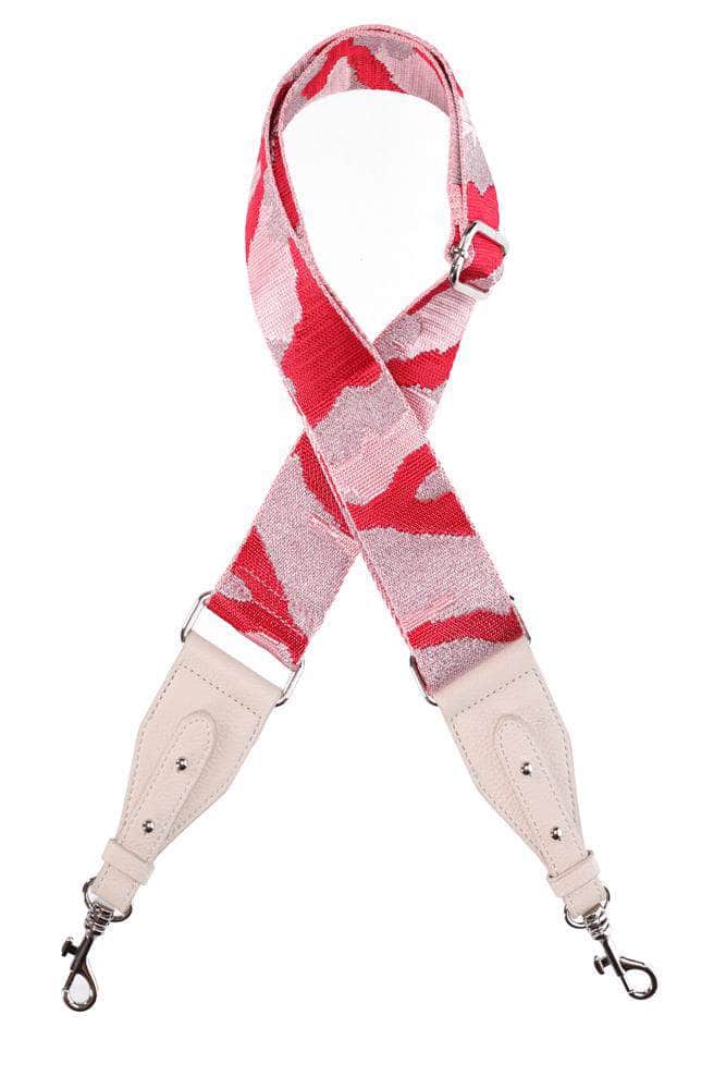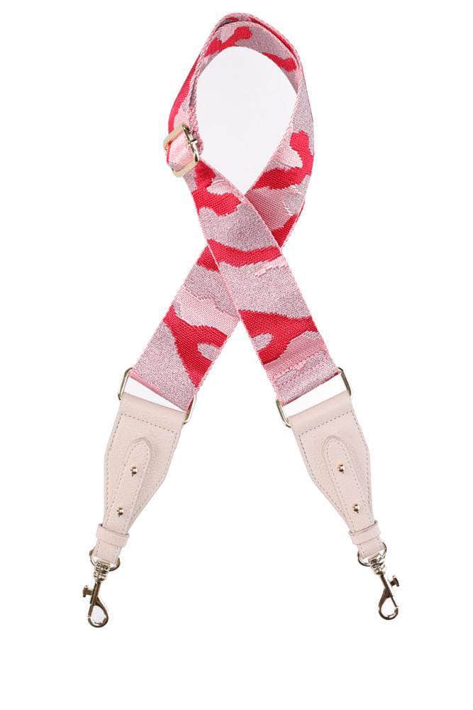 A fun pink camo sparkly adjustable woven bag strap with faux leather, and gold hardware clasps