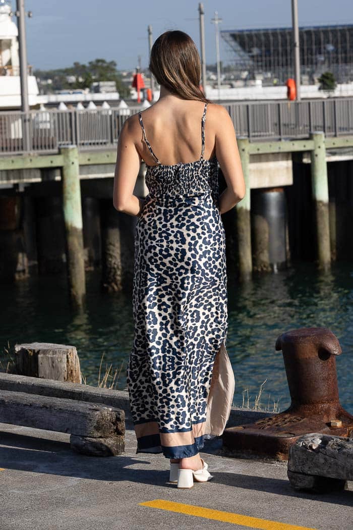 A leopard print silk maxi dress.