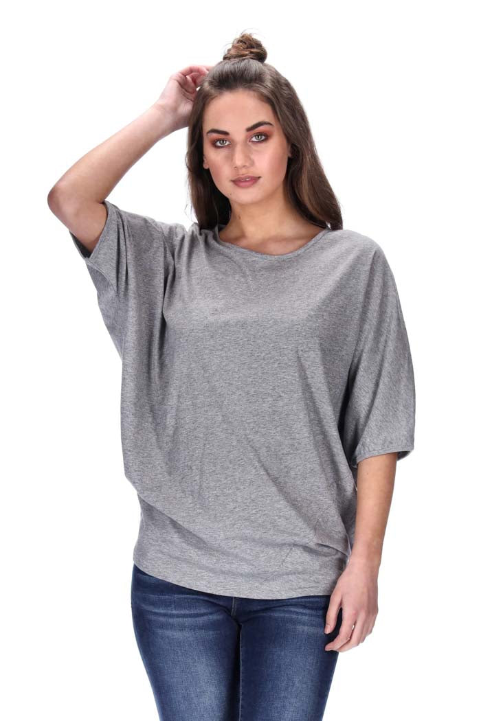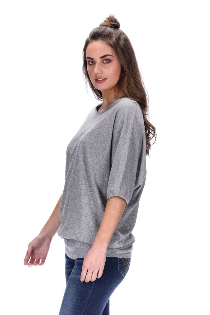 Features: Batwing sleeves, elbow length sleeves, asymmetric left side seam