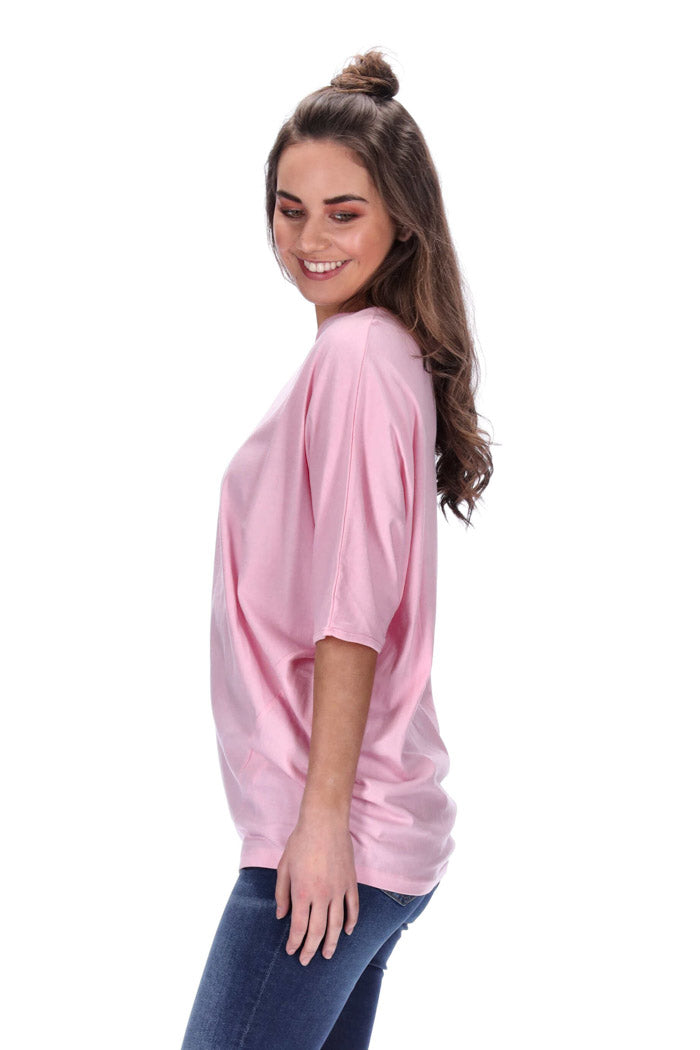 Features: Batwing sleeves, elbow length sleeves, asymmetric left side seam