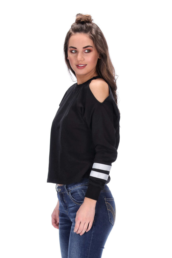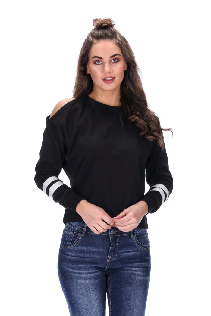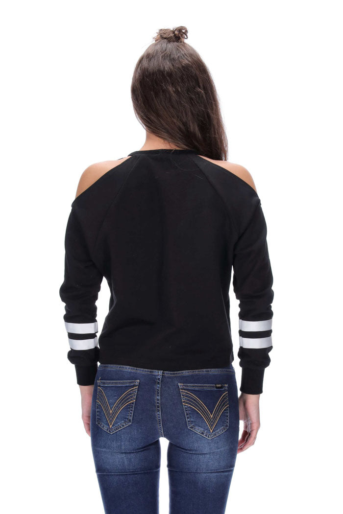 Features: Black sweater with shoulder cutouts, raglan seam and white contrast panel on sleeves