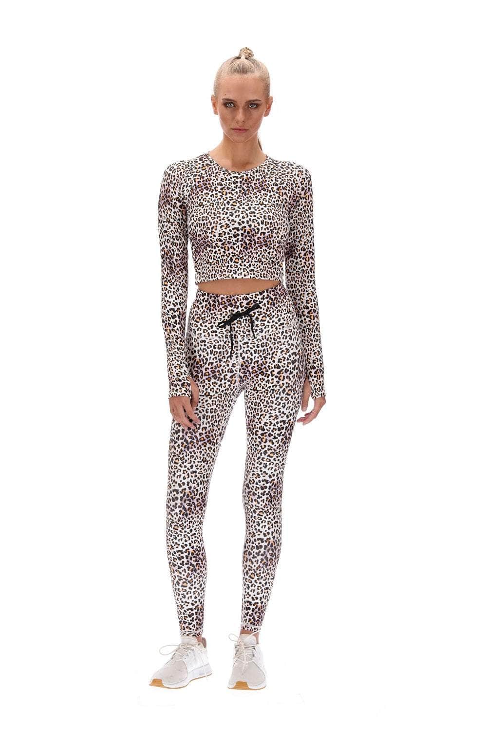 A white/pale lilac leopard print ribbed full length legging, with a black waist drawstring and a back waistband phone pocket.