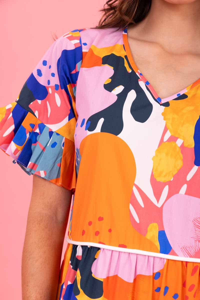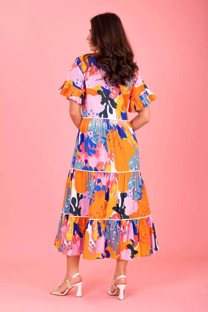 An orange & blue abstract print V neck tiered midi dress.