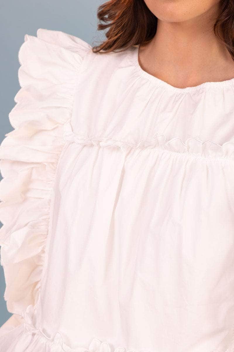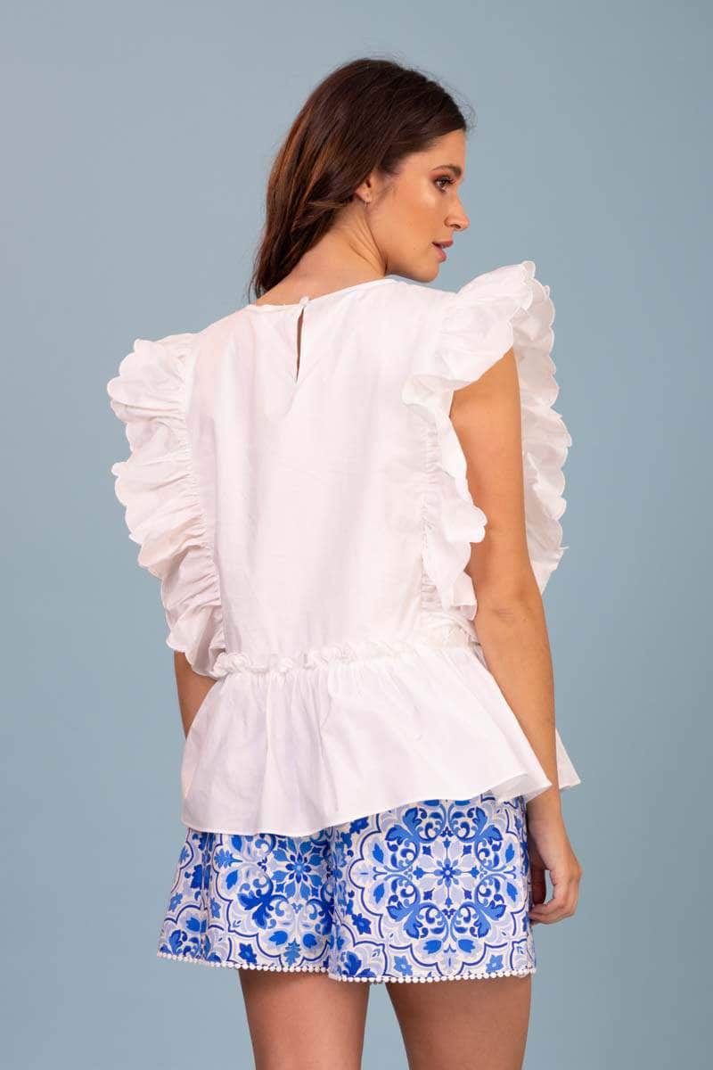 A white top with embroidered scalloped shape frills.