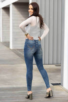 Mid-Rise dark stretch denim with a stonewash and rips all through the front.