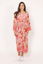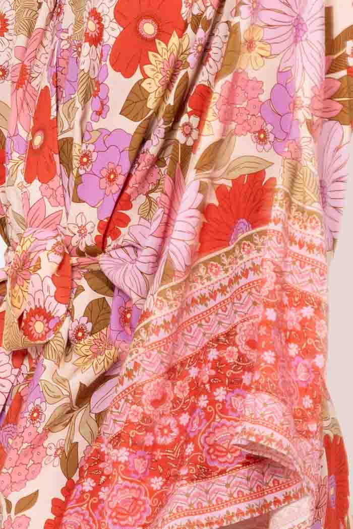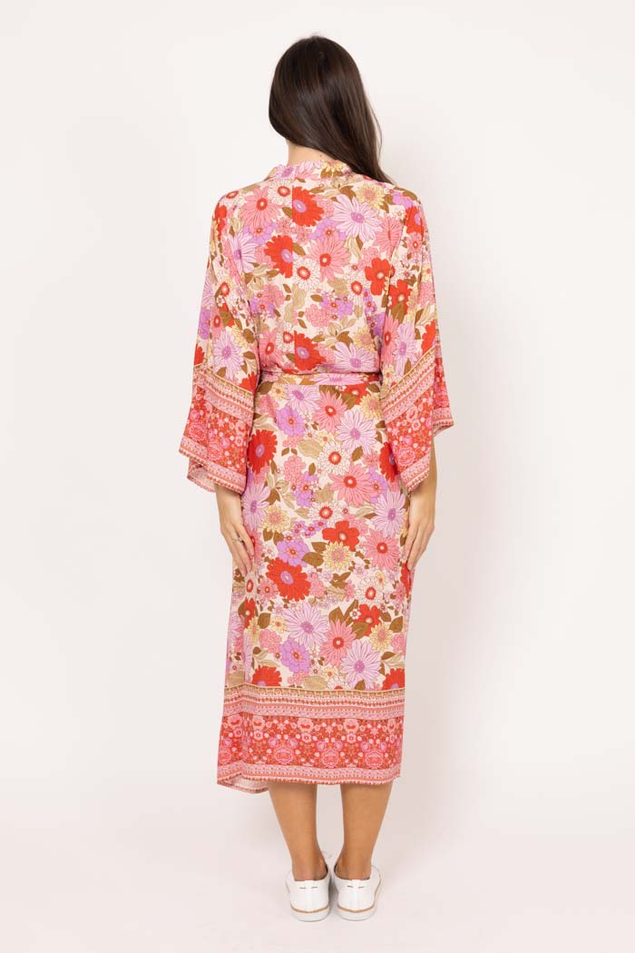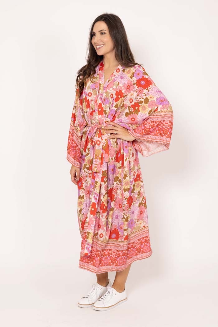 A maxi kimono in a pastel pink and red/orange boho print. With a waist drawcord.