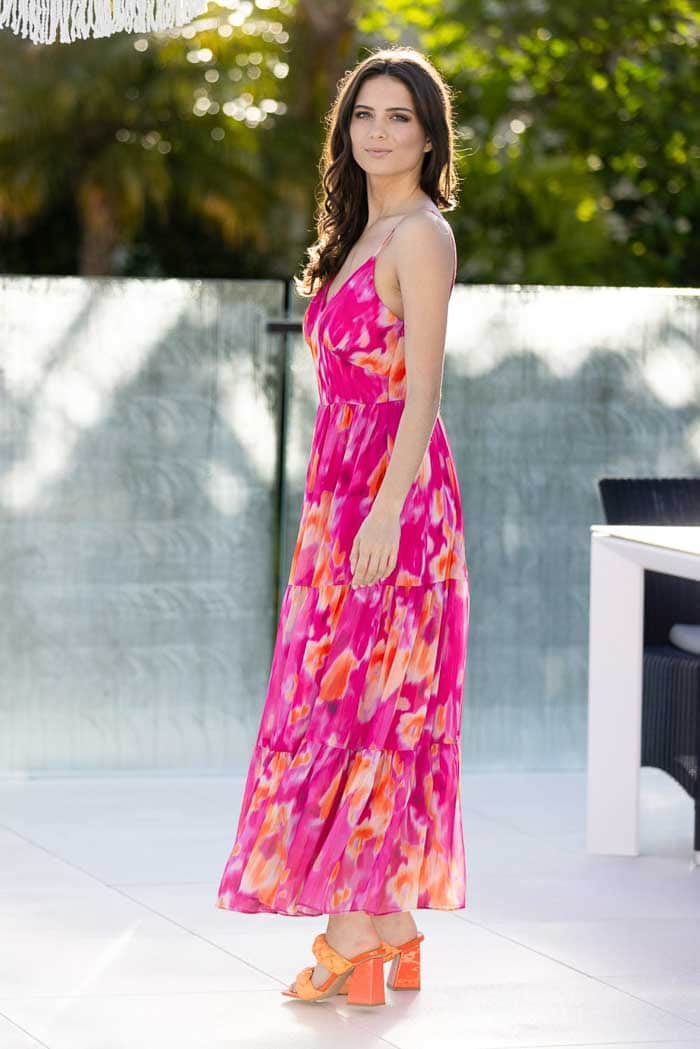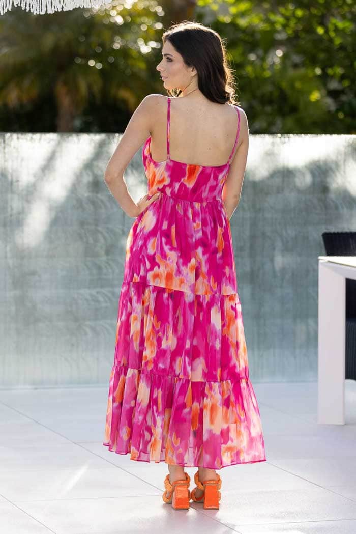 A hot pink & orange abstract tiered maxi dress.