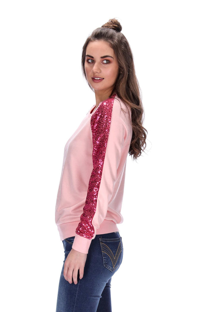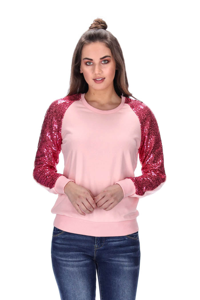Sweater with raglan seam sleeves, sequin on the front half of sleeves and chunky ribbing on hems