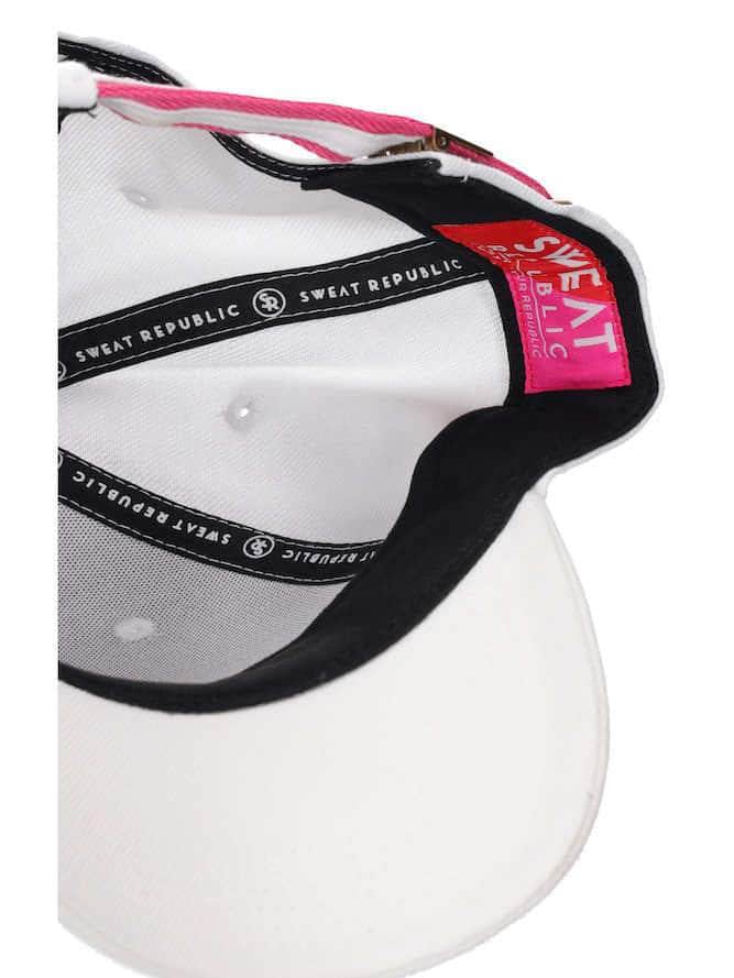 A white cap with embroidered pink Sweat logo at the front and adjustable back strap
