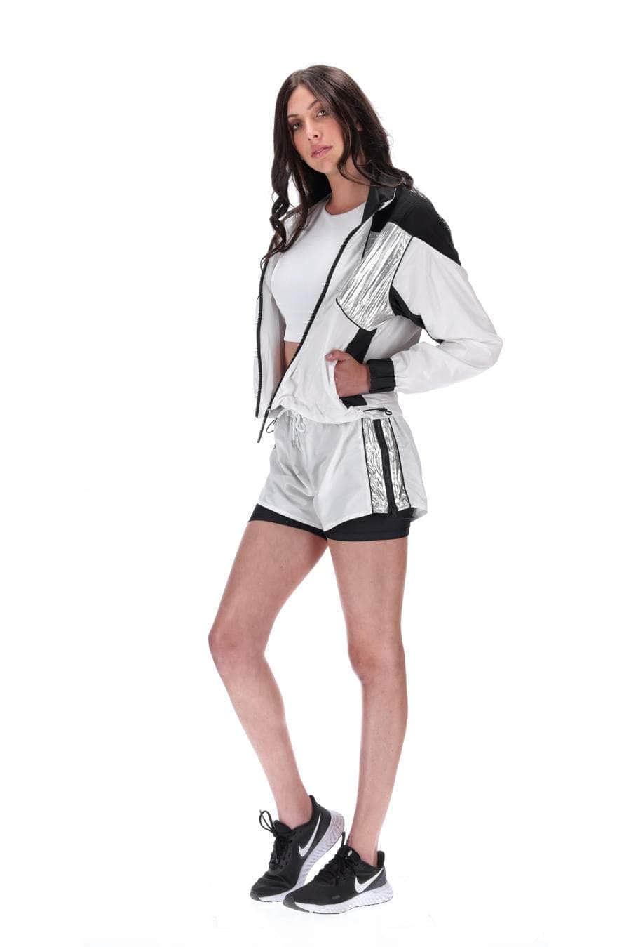 A white & black woven jacket with silver reflective panels on the front, and black mesh across the shoulders and down the back. Chunky black zipper down the front with a SR branded zipper puller. Invisible in seam zip pockets on the front sides. Drawstring hemline. Elasticated cuffs.