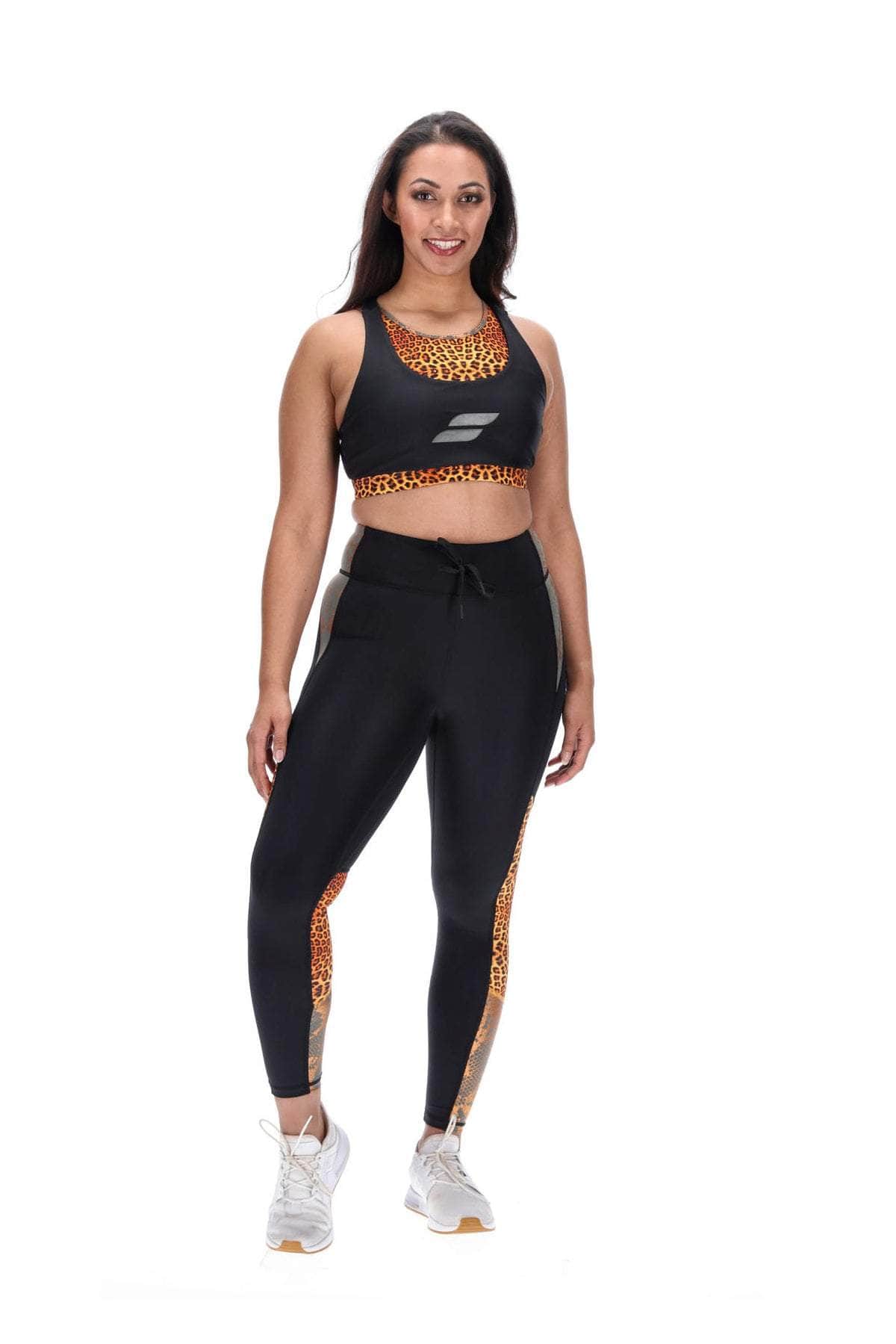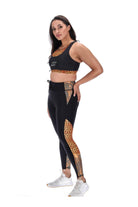 A black full length legging with khaki scale print & orange leopard print side & back leg panels. Back waistband phone pocket.