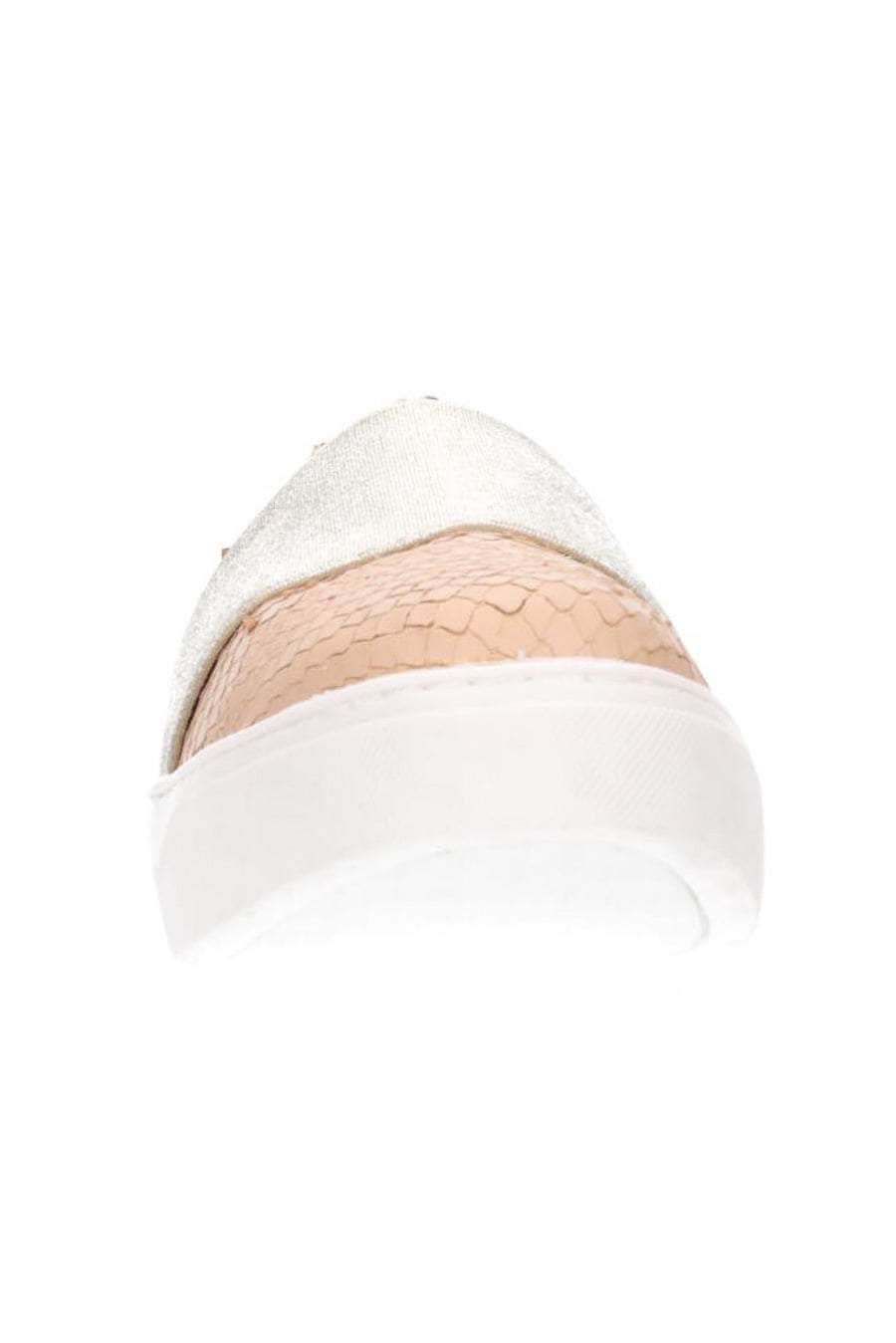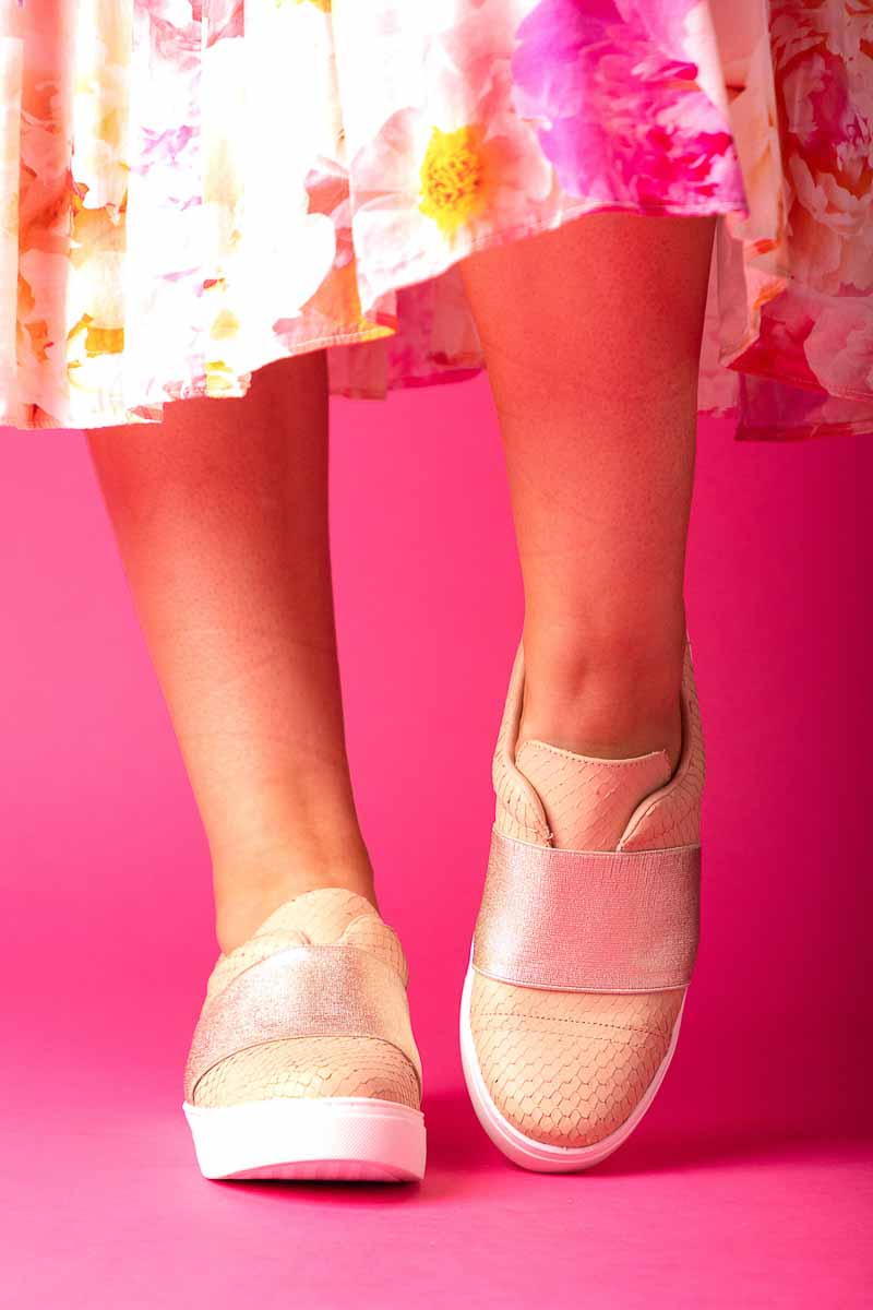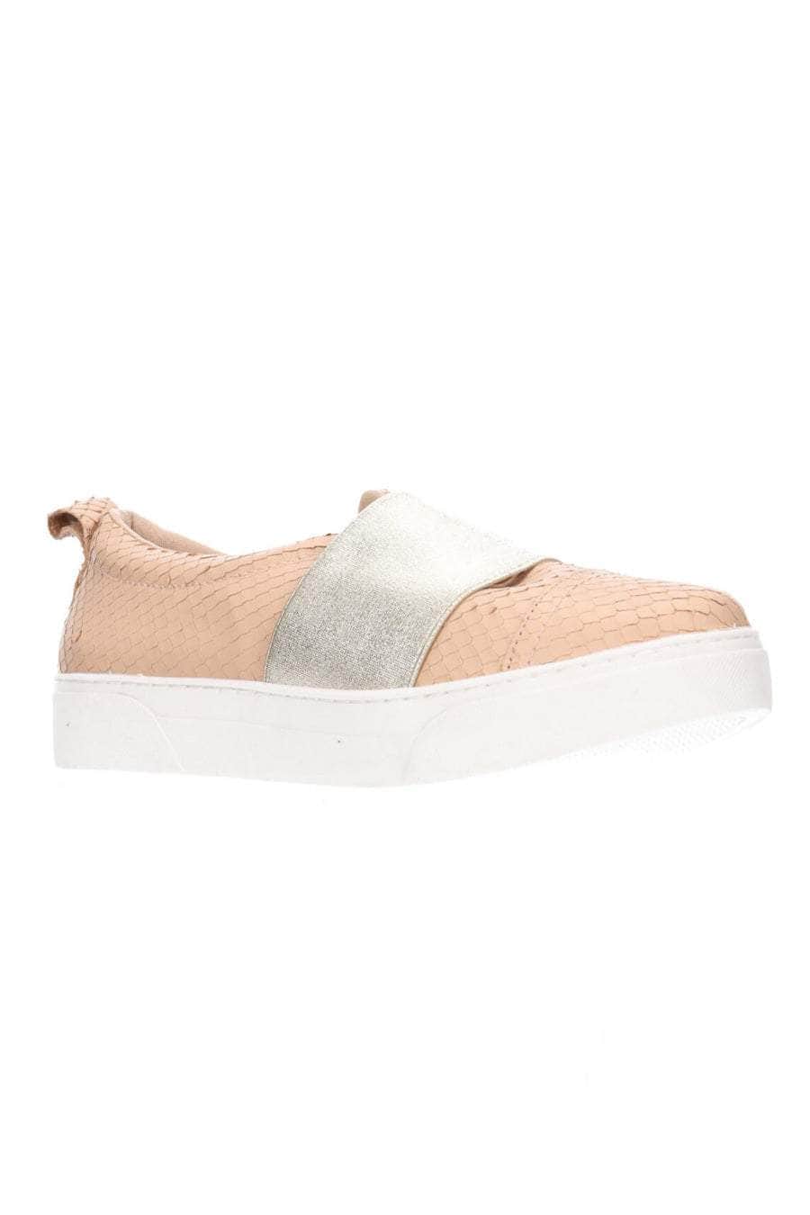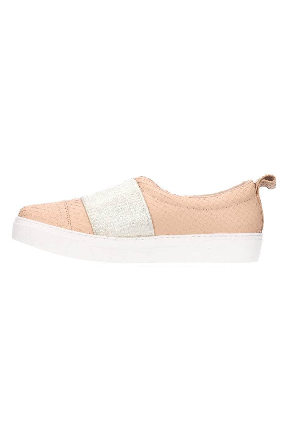 A nude scale print slip-on sneaker with a wide elastic band.