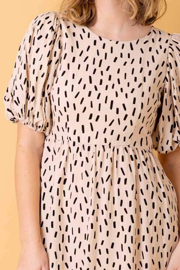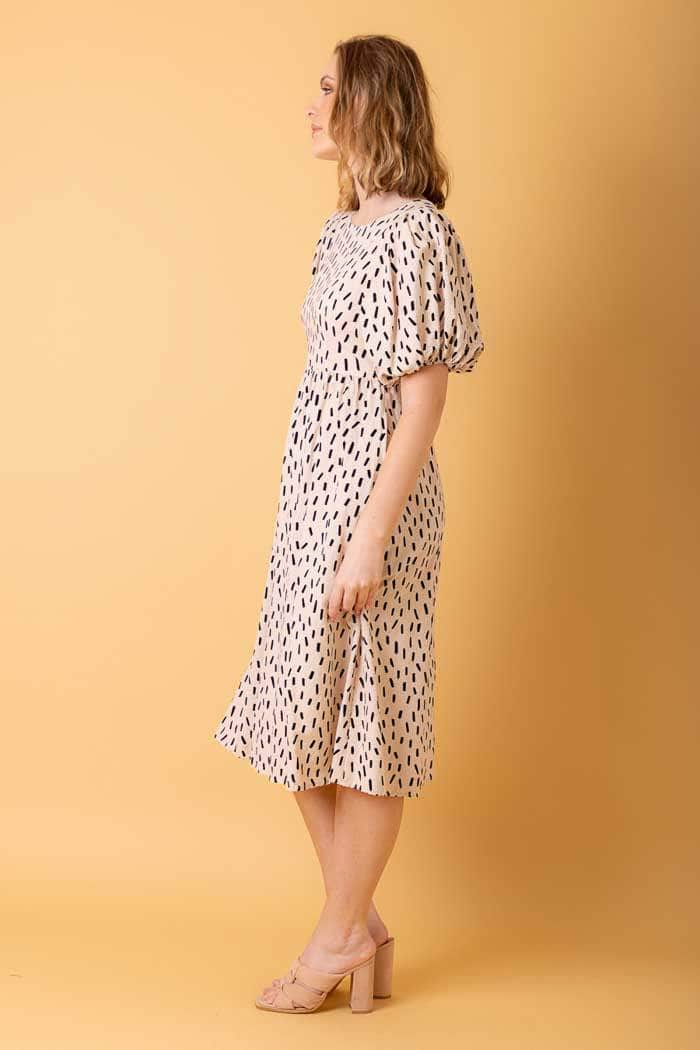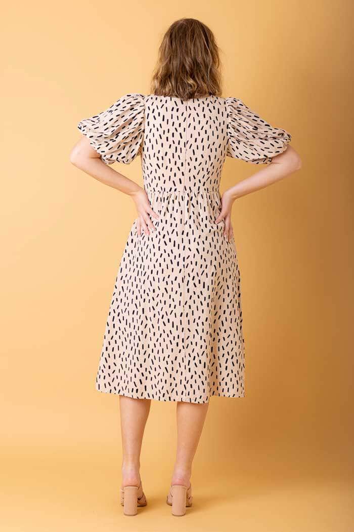 A beige speck print midi dress with puffy sleeves.