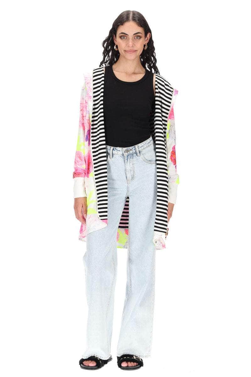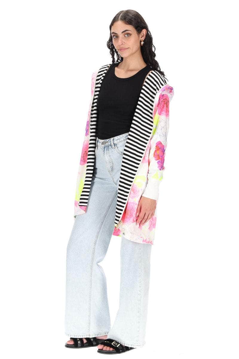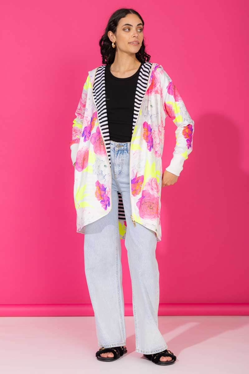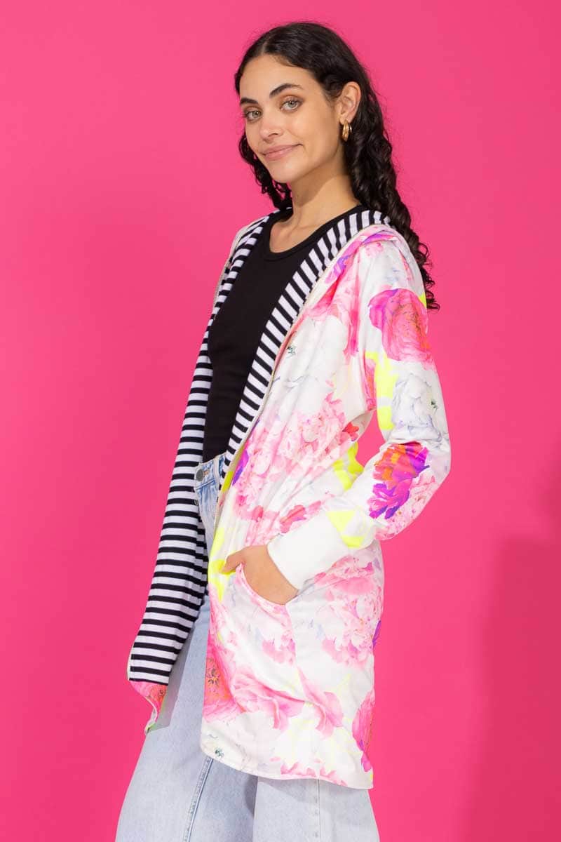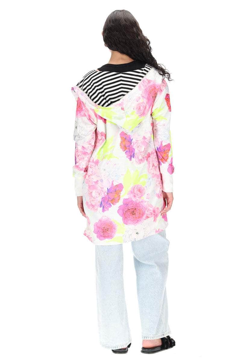 A white based floral print reversible hooded sweater.