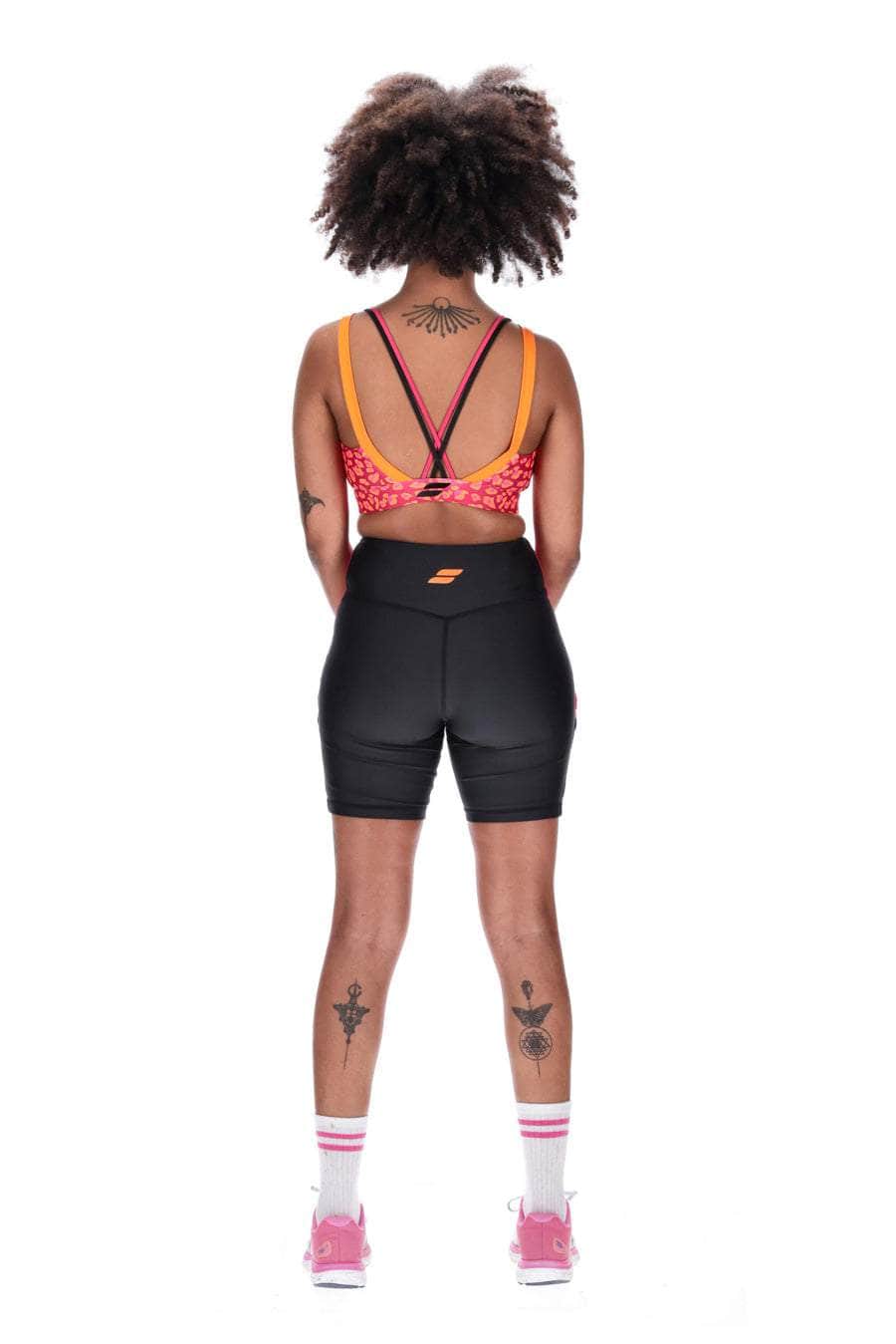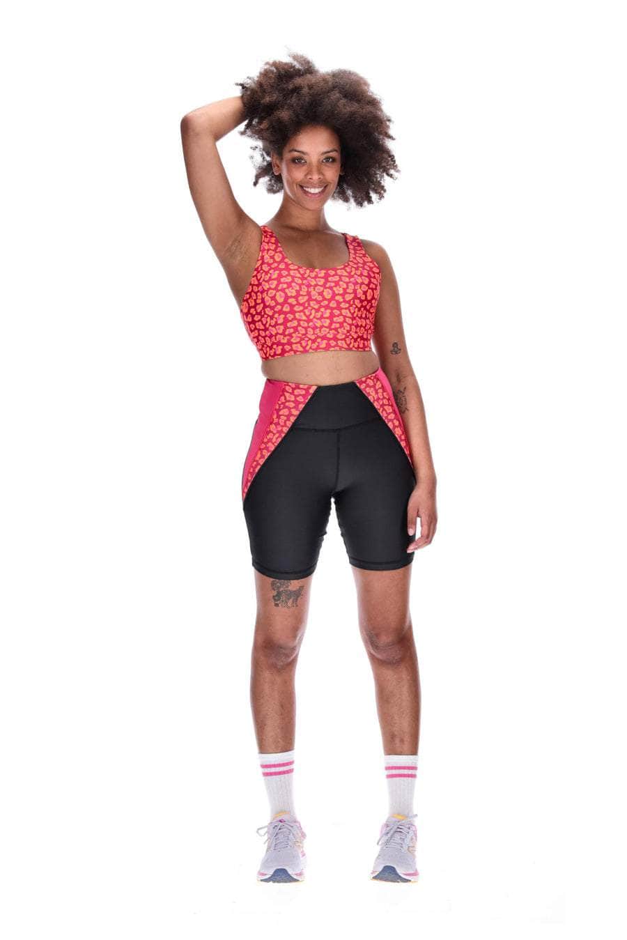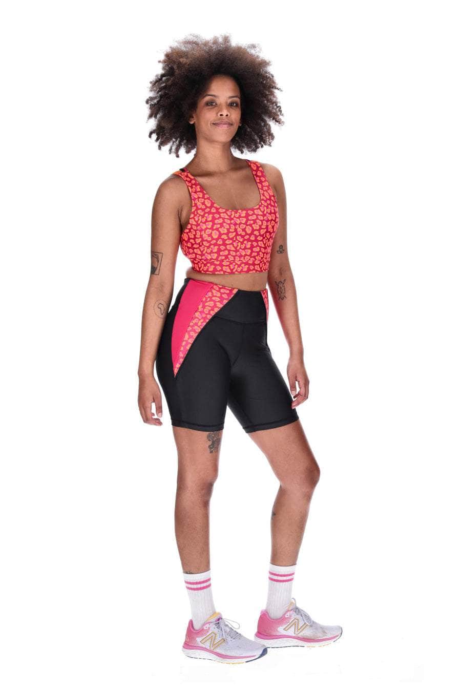 A black biker with pink leopard print side panels.
