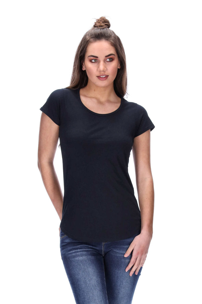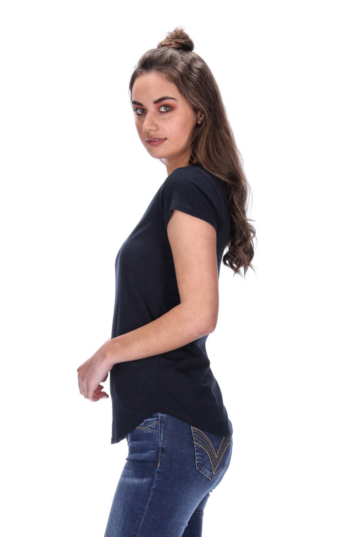 Features: Capped sleeves, curved hem