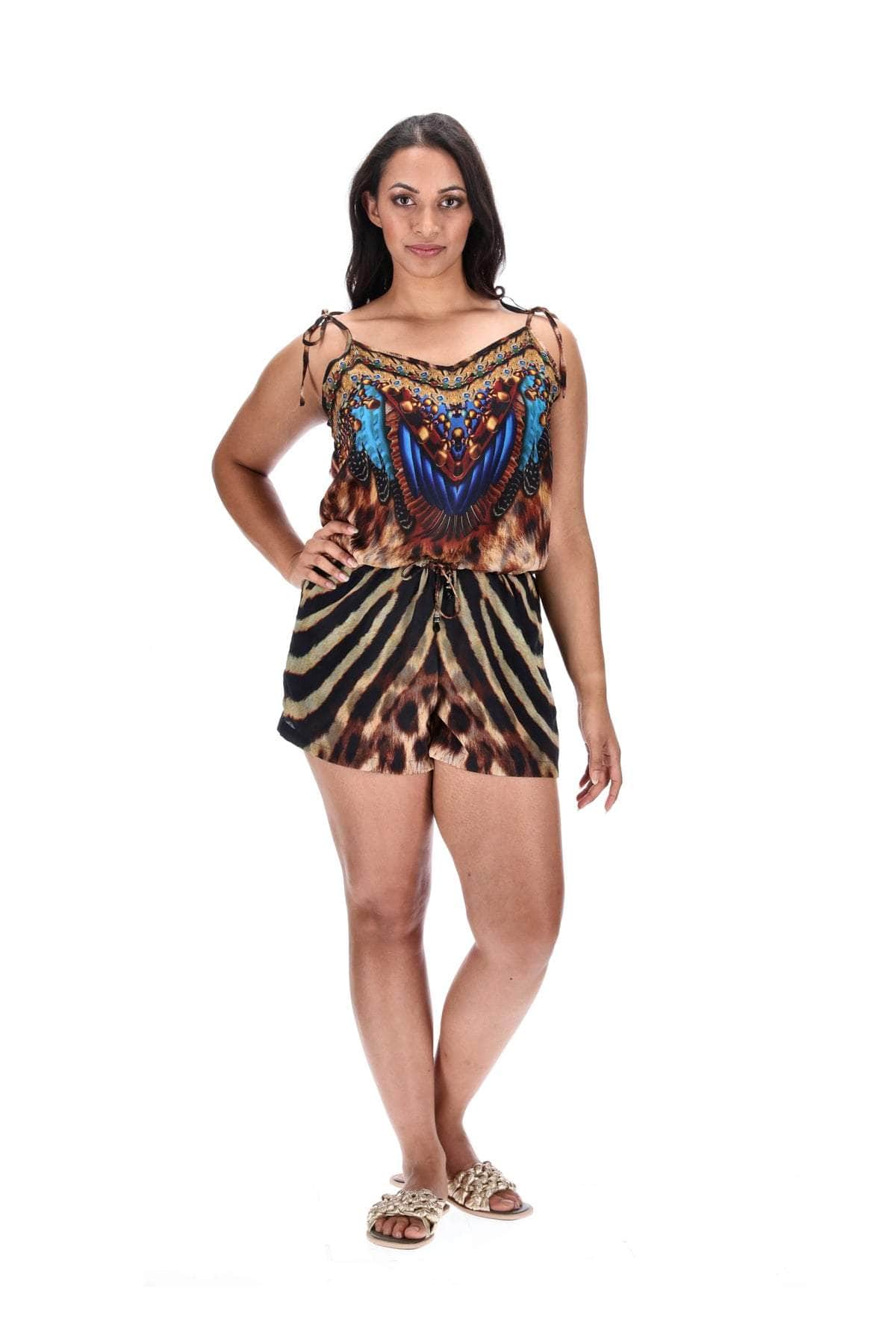 An abstract leopard print playsuit with thin shoulder straps, and a drawstring tied waistline.