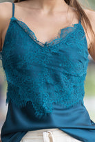 A satin teal singlet with lace to the middle/waist area.