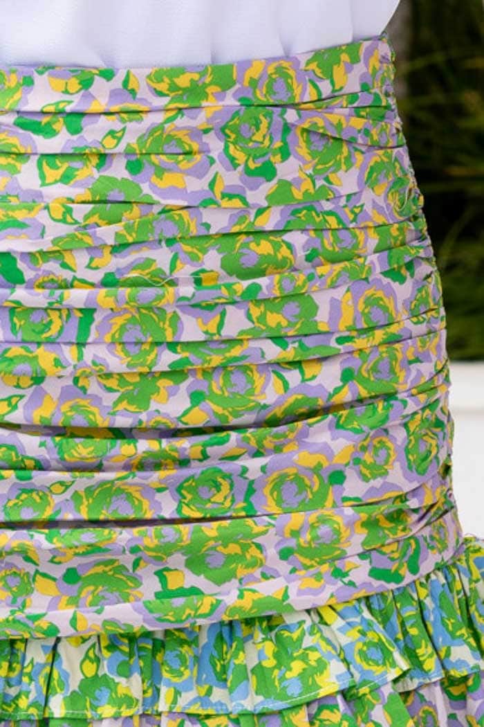 A ruched green floral mini skirt.