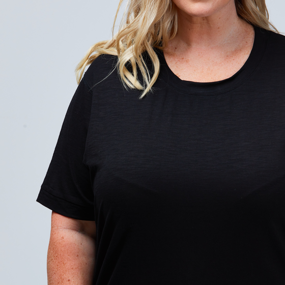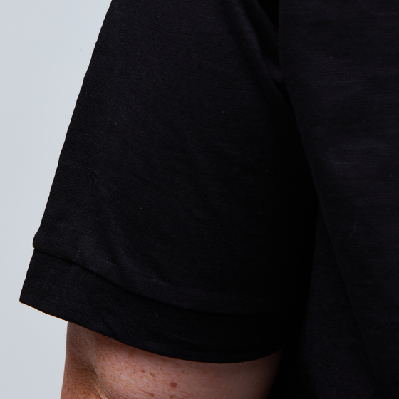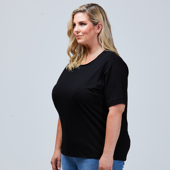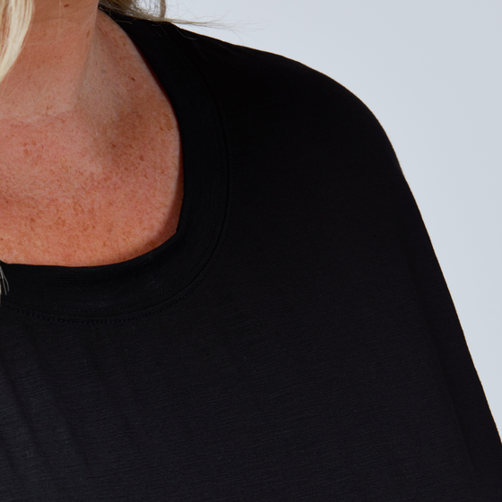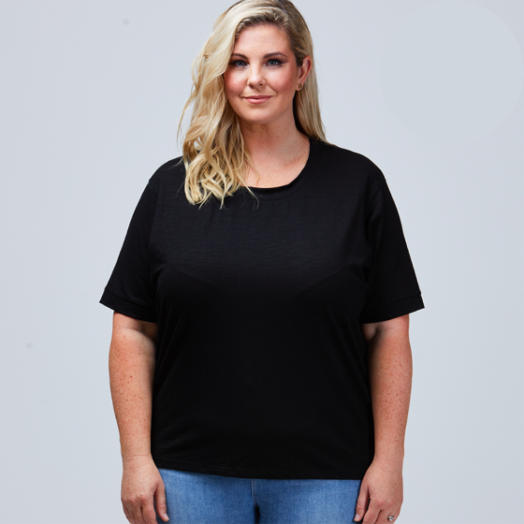 Feature: Short sleeves finished with bands and stitched panel seams, slightly shorter length body creating a more square shape, especially good for column and apple figure types