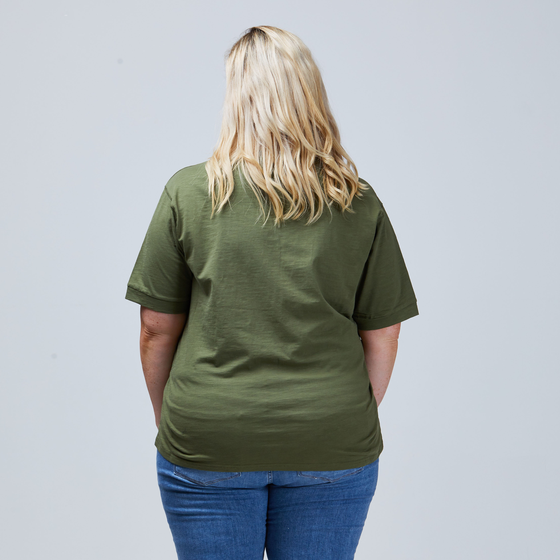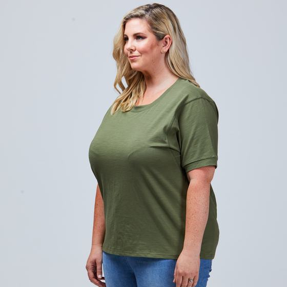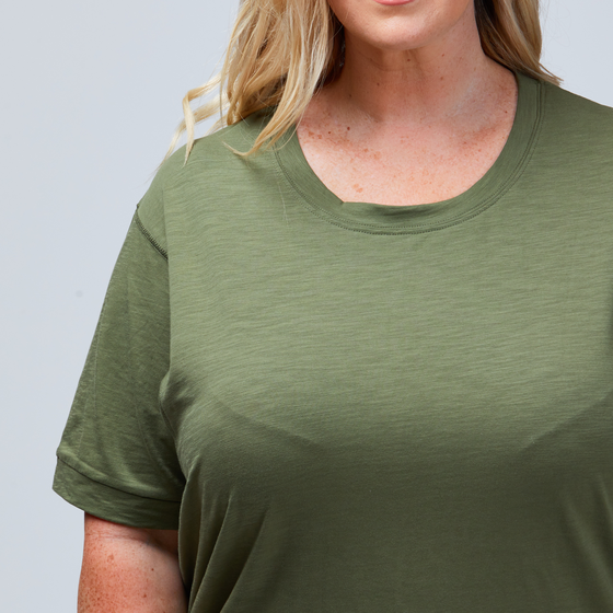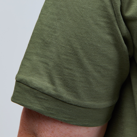 Feature: Short sleeves finished with bands and stitched panel seams, slightly shorter length body creating a more square shape, especially good for column and apple figure types