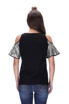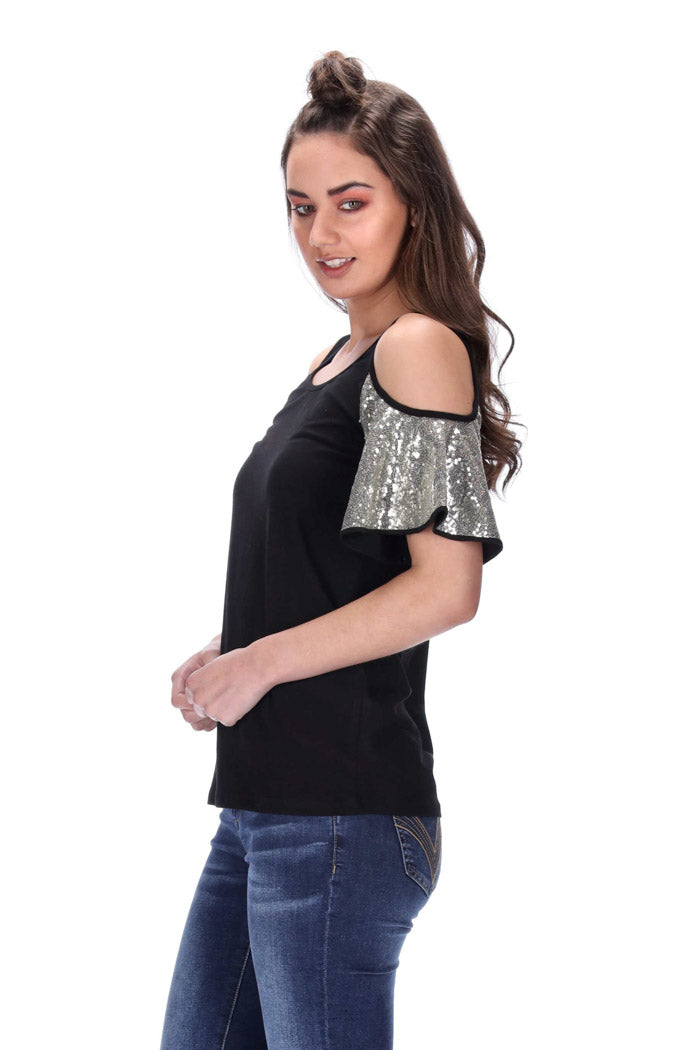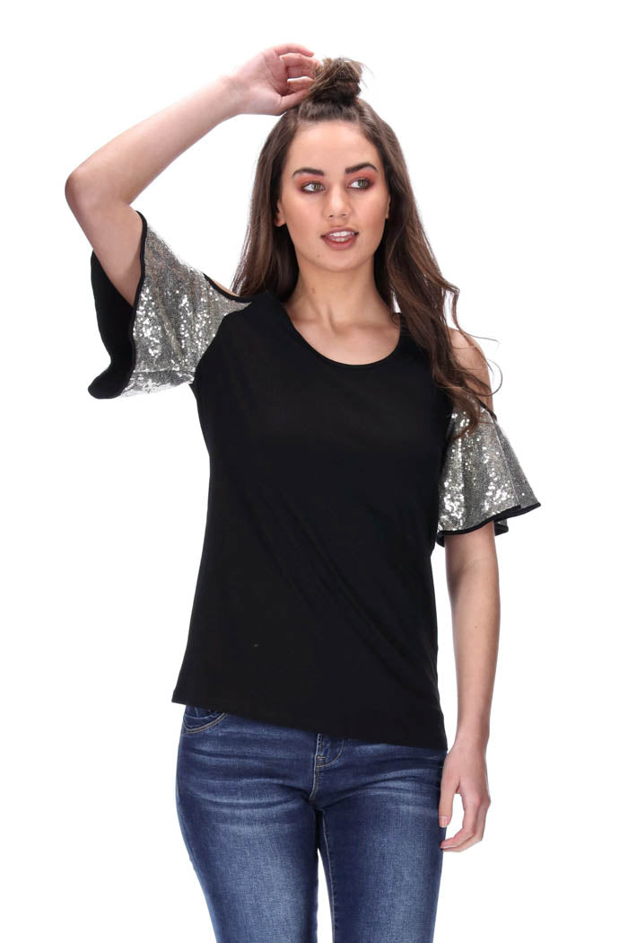 T-Shirt Features: A revamp on the skyler with contrasting sequin sleeves, shoulder cutouts and a straight hemline